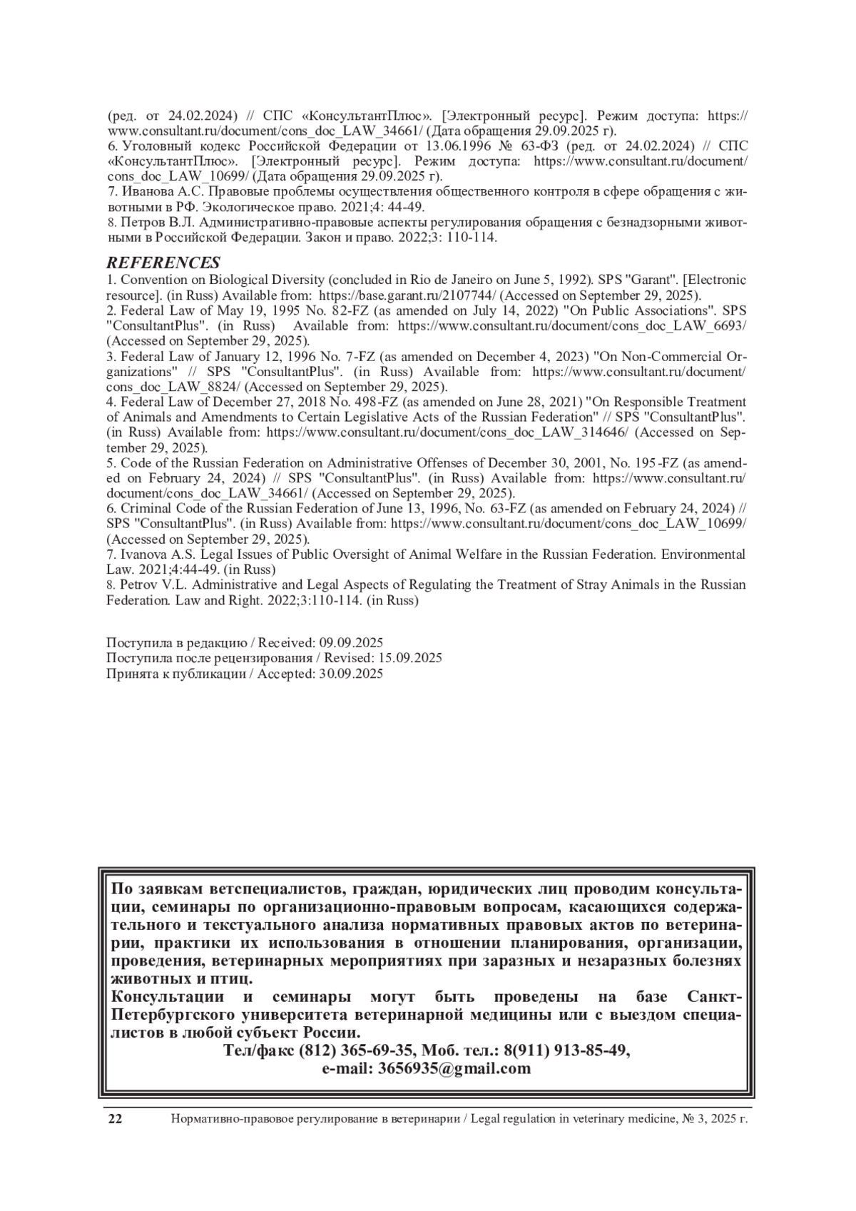 8. Петров В.Л. Административно-правовые аспекты регулирования обращения с безнадзорными животными в Российской Федерации. Закон и право. 2022;3: 110-114.