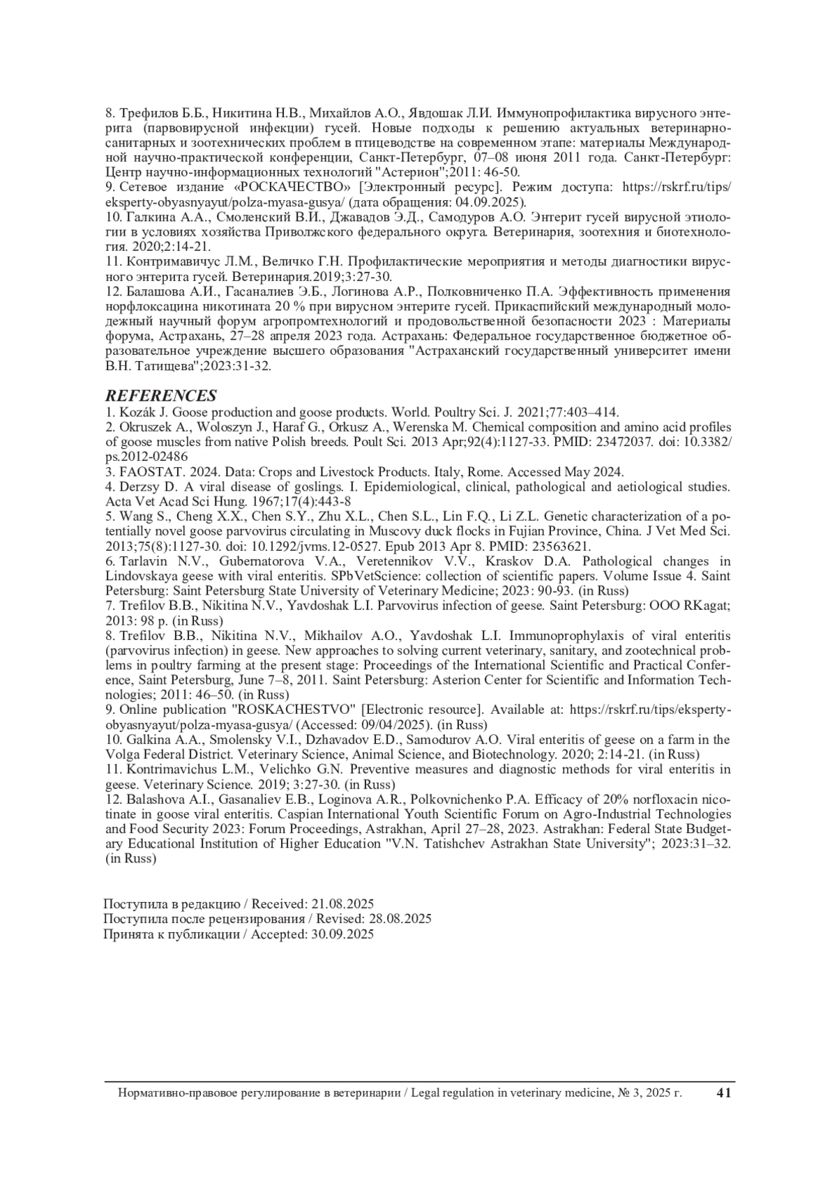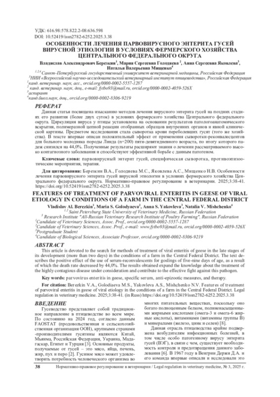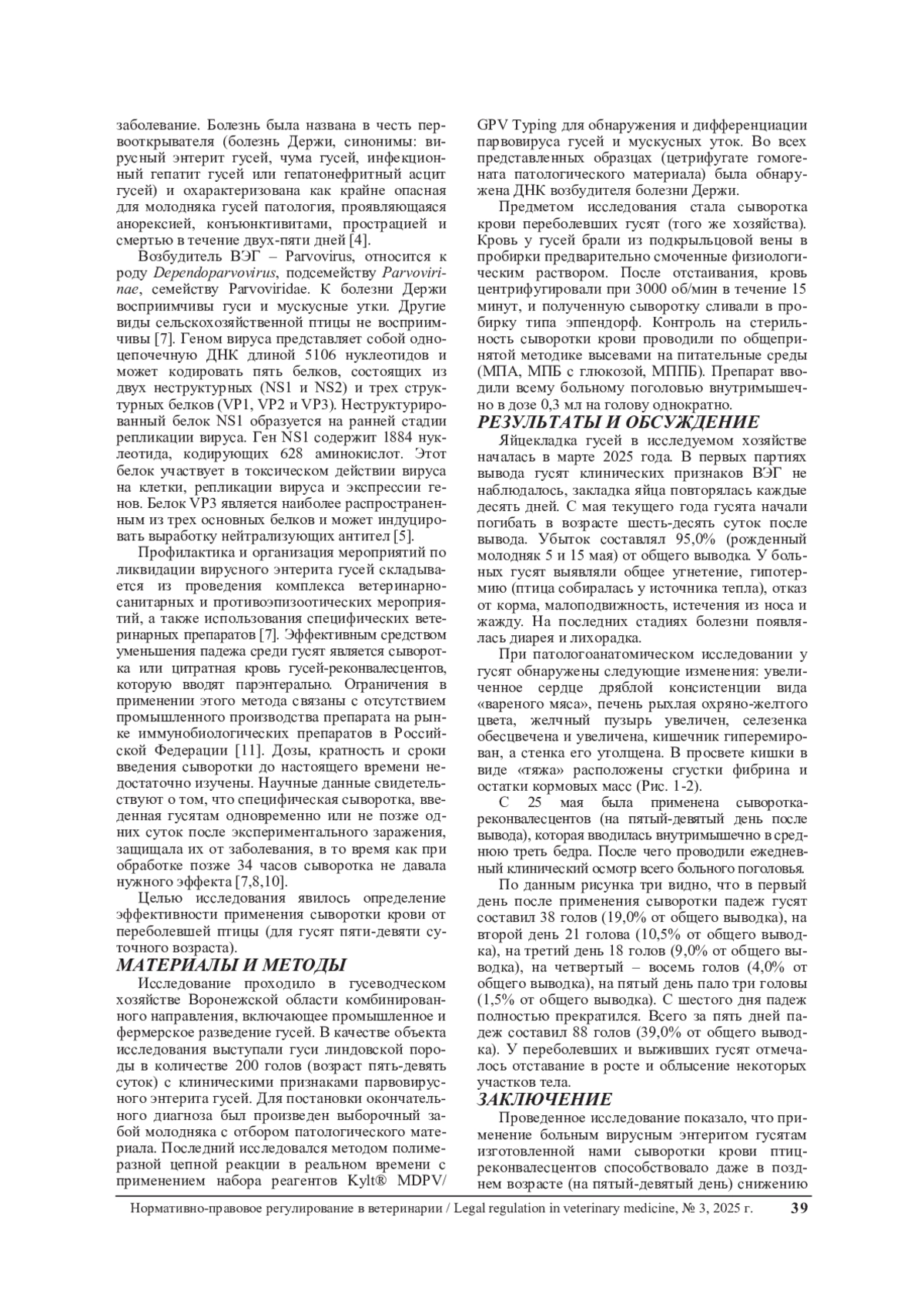 Статья: ОСОБЕННОСТИ ЛЕЧЕНИЯ ПАРВОВИРУСНОГО ЭНТЕРИТА ГУСЕЙ ВИРУСНОЙ ЭТИОЛОГИИ В УСЛОВИЯХ ФЕРМЕРСКОГО ХОЗЯЙСТВА ЦЕНТРАЛЬНОГО ФЕДЕРАЛЬНОГО ОКРУГА (2025)