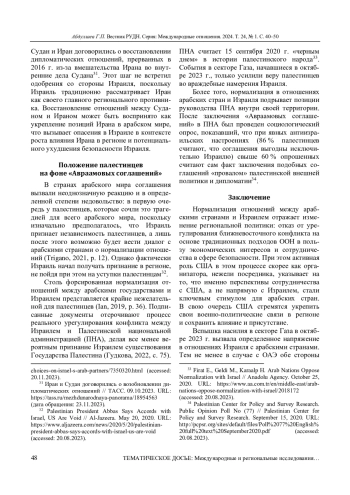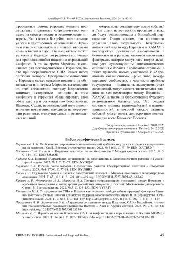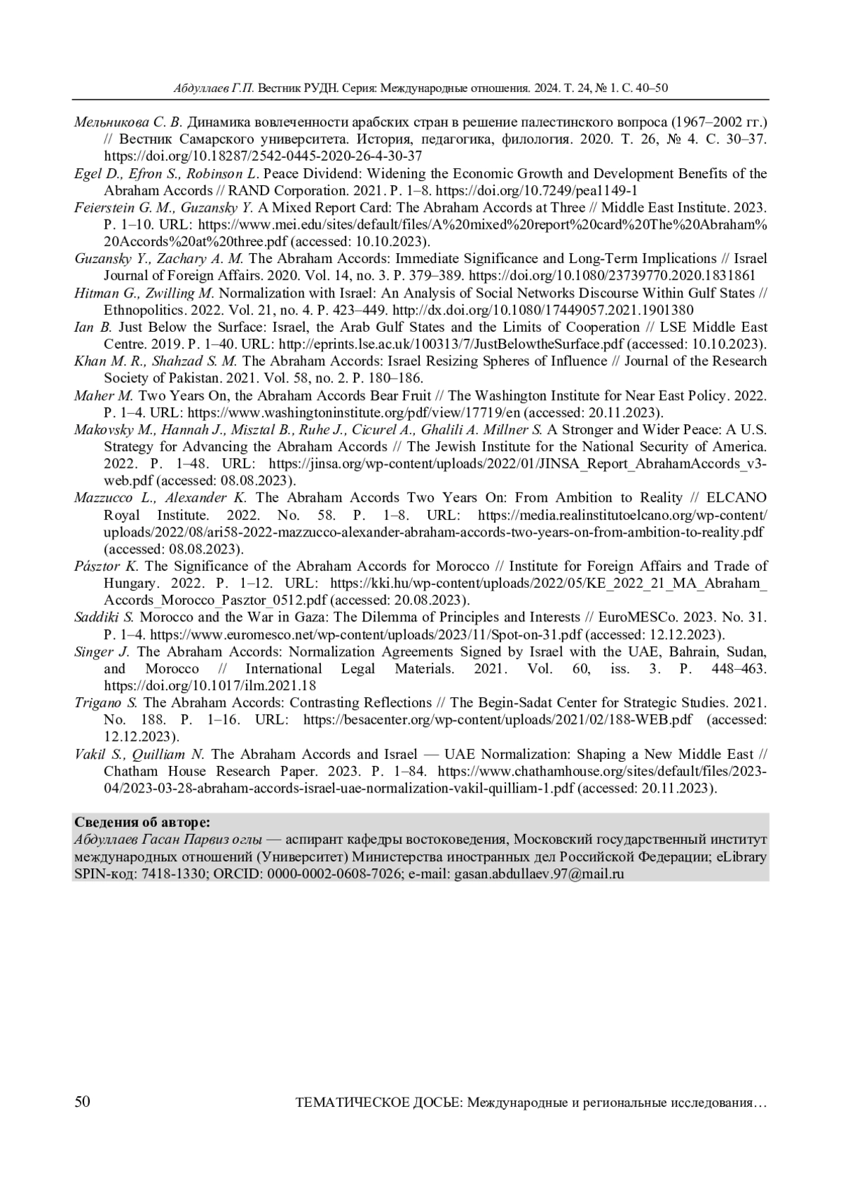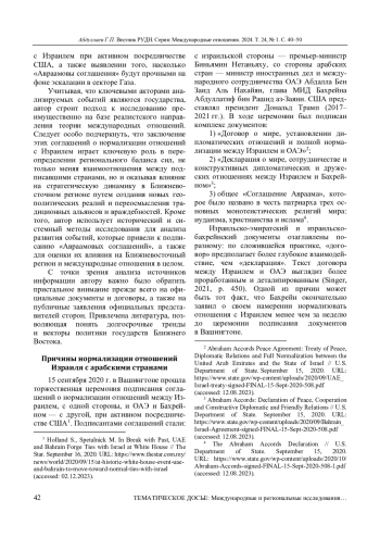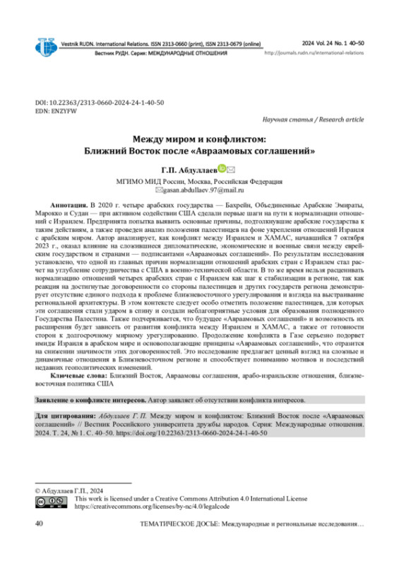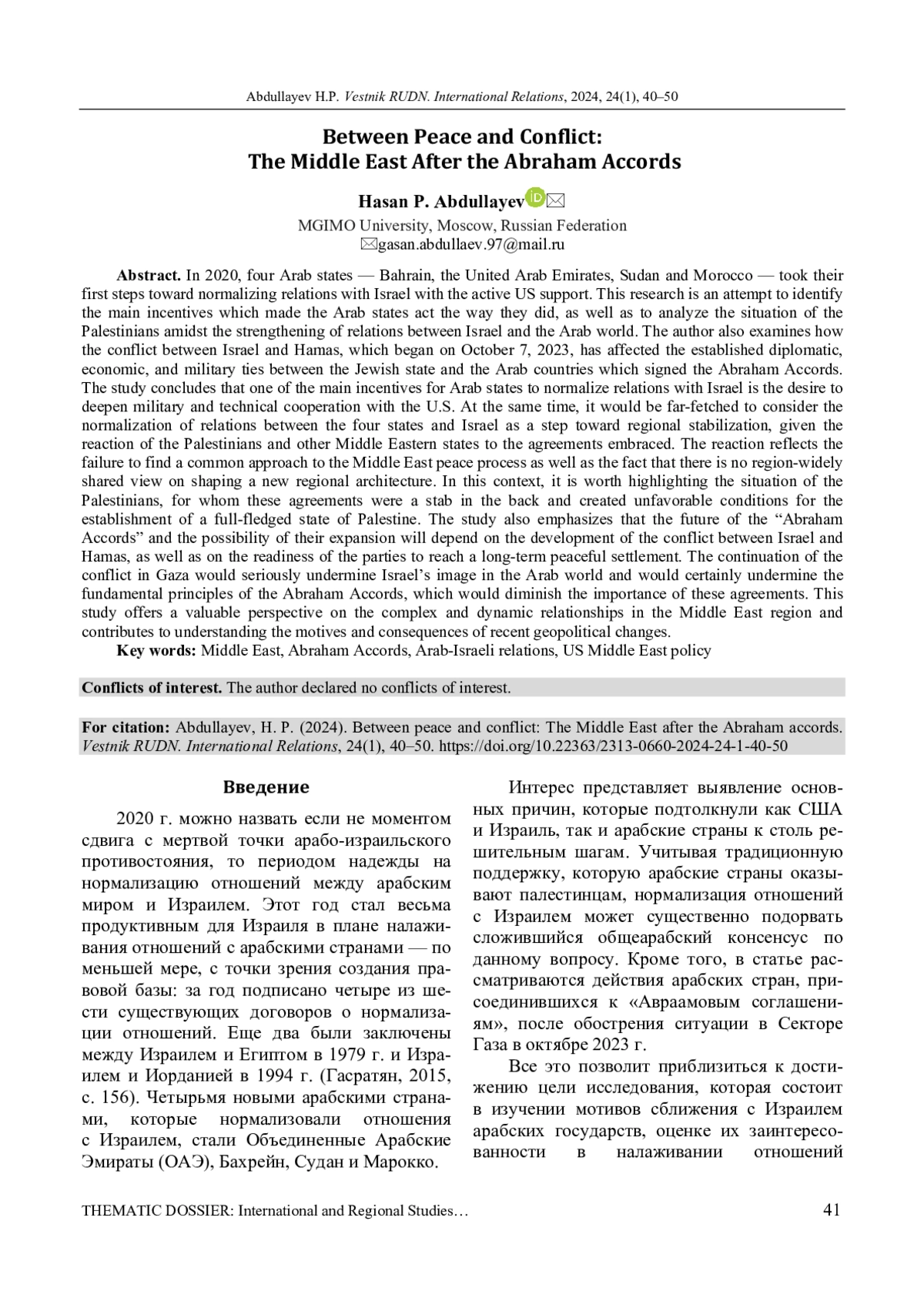 АБДУЛЛАЕВ Г. П. МЕЖДУ МИРОМ И КОНФЛИКТОМ: БЛИЖНИЙ ВОСТОК ПОСЛЕ "АВРААМОВЫХ CОГЛАШЕНИЙ" // ВЕСТНИК РОССИЙСКОГО УНИВЕРСИТЕТА ДРУЖБЫ НАРОДОВ. СЕРИЯ: МЕЖДУНАРОДНЫЕ ОТНОШЕНИЯ. 2024. ТОМ 24 № 1