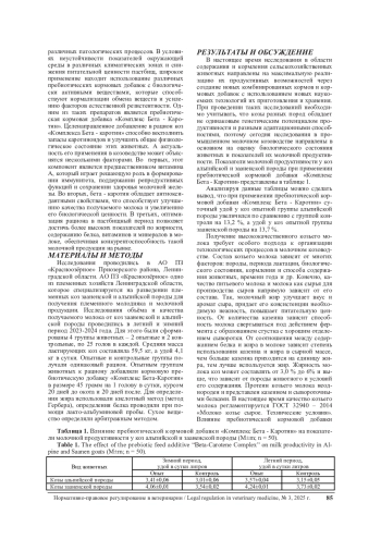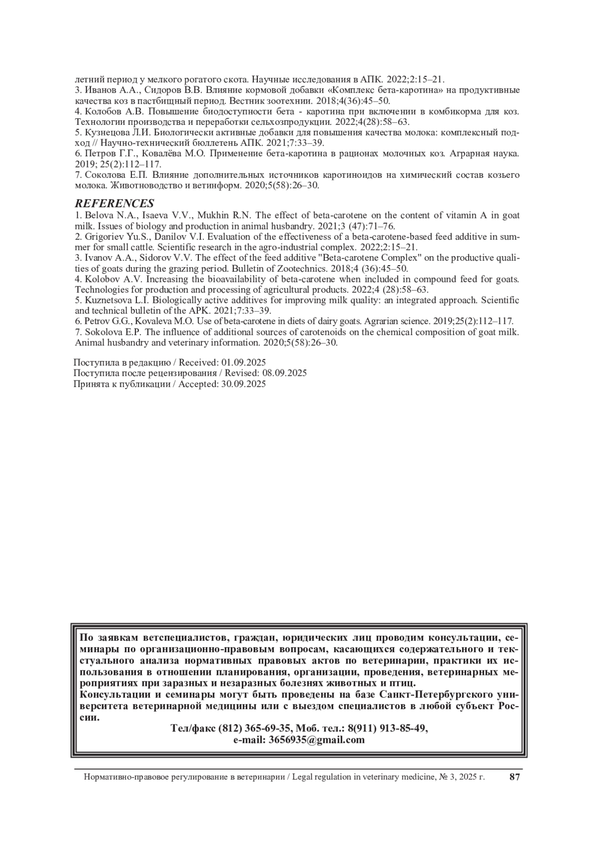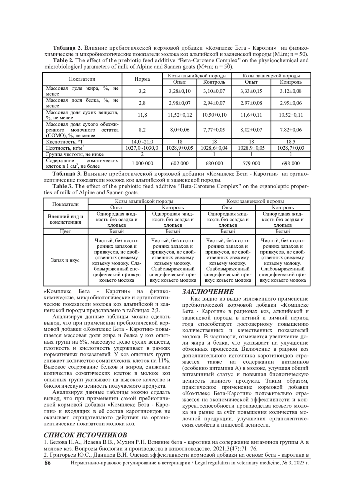 ВОРОБЦОВ Д. В., БЕЛОПОЛЬСКИЙ А. Е. ГИГИЕНИЧЕСКАЯ ОЦЕНКА ВЛИЯНИЯ ПРЕБИОТИЧЕСКОЙ КОРМОВОЙ ДОБАВКИ «КОМПЛЕКС БЕТА-КАРОТИН» НА МОЛОЧНУЮ ПРОДУКТИВНОСТЬ КОЗ АЛЬПИЙСКОЙ И ЗААНЕНСКОЙ ПОРОДЫ // НОРМАТИВНО-ПРАВОВОЕ РЕГУЛИРОВАНИЕ В ВЕТЕРИНАРИИ. 2025. № 3