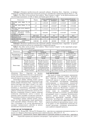 Статья: ГИГИЕНИЧЕСКАЯ ОЦЕНКА ВЛИЯНИЯ ПРЕБИОТИЧЕСКОЙ КОРМОВОЙ ДОБАВКИ «КОМПЛЕКС БЕТА-КАРОТИН» НА МОЛОЧНУЮ ПРОДУКТИВНОСТЬ КОЗ АЛЬПИЙСКОЙ И ЗААНЕНСКОЙ ПОРОДЫ (2025)