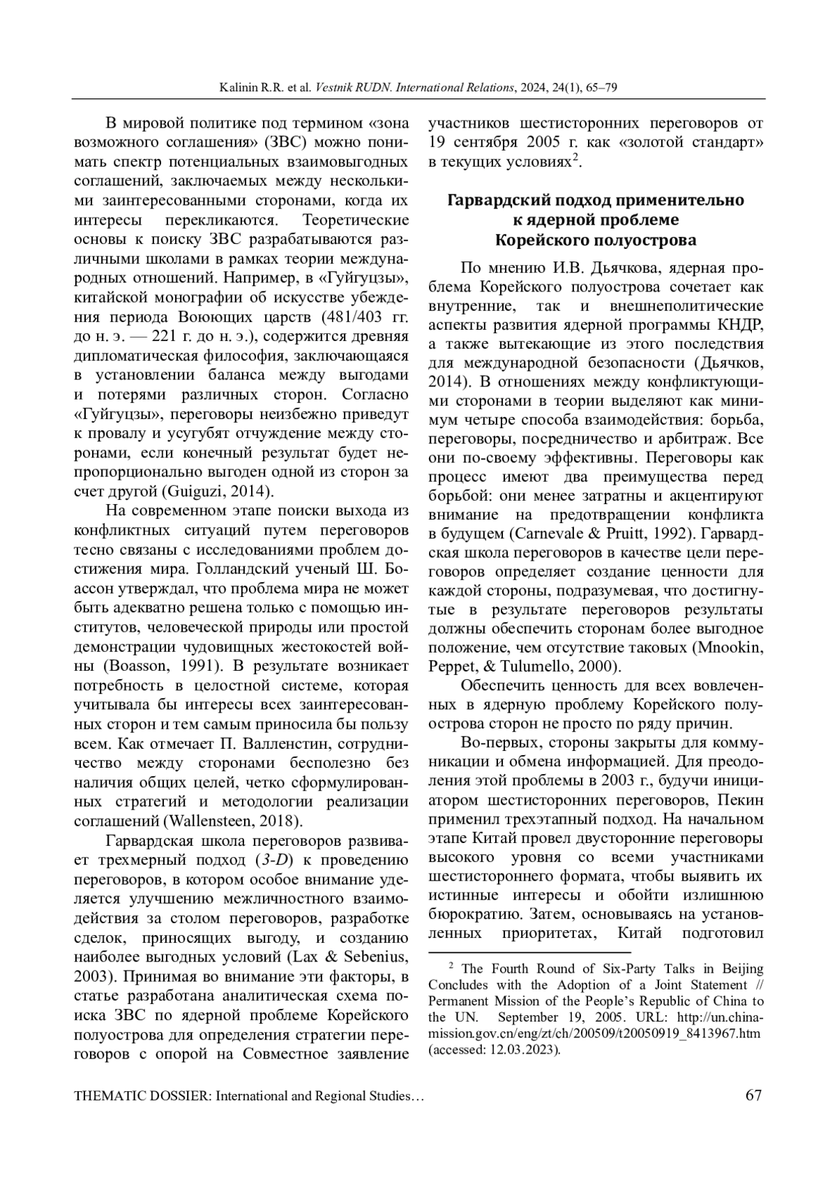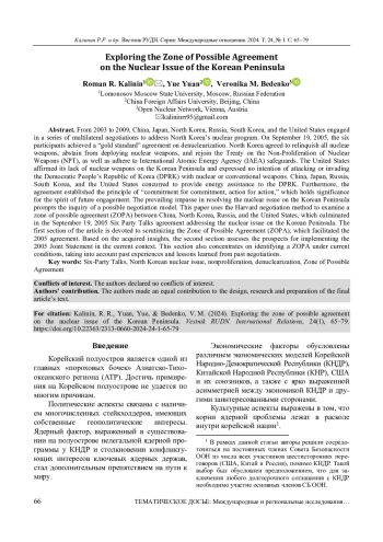С 2003 по 2009 г. Китайская Народная Республика (КНР), Корейская Народная Демократическая Республика (КНДР), Республика Корея (РК), Российская Федерация, США и Япония провели ряд многосторонних переговоров по денуклеаризации Корейского полуострова. 19 сентября 2005 г. был достигнут «золотой стандарт» соглашений по денуклеаризации. КНДР обязалась отказаться от ядерного оружия, воздержаться от развертывания ядерного оружия и вернуться к соблюдению условий Договора о нераспространении ядерного оружия (ДНЯО) и гарантий Международного агентства по атомной энергии (МАГАТЭ). США подтвердили отсутствие ядерного оружия на Корейском полуострове и намерений напасть или вторгнуться в КНДР. Все стороны согласились оказать энергетическую помощь КНДР. Соглашение также установило принцип «обязательства в обмен на обязательства, действия в обмен на действия». Используется Гарвардский метод переговоров для анализа зоны возможного соглашения (ЗВС), элементы которого прослеживаются в переговорах, окончившихся принятием соглашения от 19 сентября 2005 г. между участниками Шестисторонних переговоров по ядерной проблеме Корейского полуострова. С помощью полученных результатов оцениваются перспективы применения ЗВС от 2005 г. в нынешних реалиях. Первый раздел посвящен анализу ЗВС, которая привела к соглашению 2005 г. Второй раздел сосредоточен на поиске ЗВС в нынешних условиях с учетом предыдущего опыта.