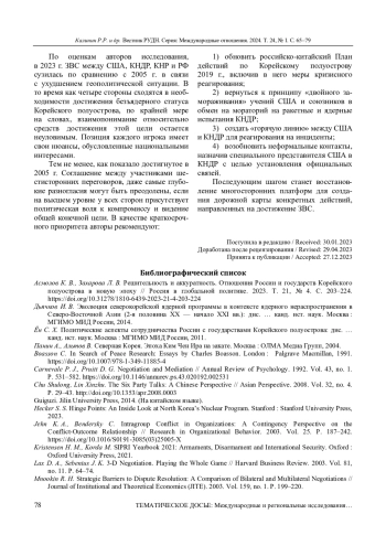 1. Асмолов К. В., Захарова Л. В. Решительность и аккуратность. Отношения России и государств Корейского полуострова в новую эпоху // Россия в глобальной политике. 2023. Т. 21, № 4. С. 203-224. DOI: 10.31278/1810-6439-2023-21-4-203-224 EDN: RWJEGI