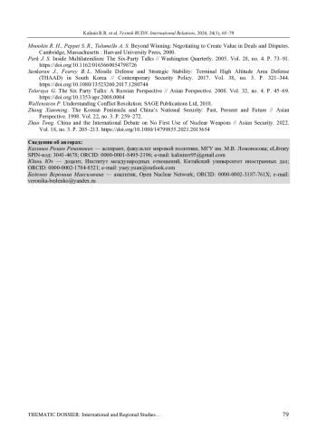 15. Park J. S. Inside Multilateralism: The Six-Party Talks // Washington Quarterly. 2005. Vol. 28, no. 4. P. 73-91. DOI: 10.1162/0163660054798726