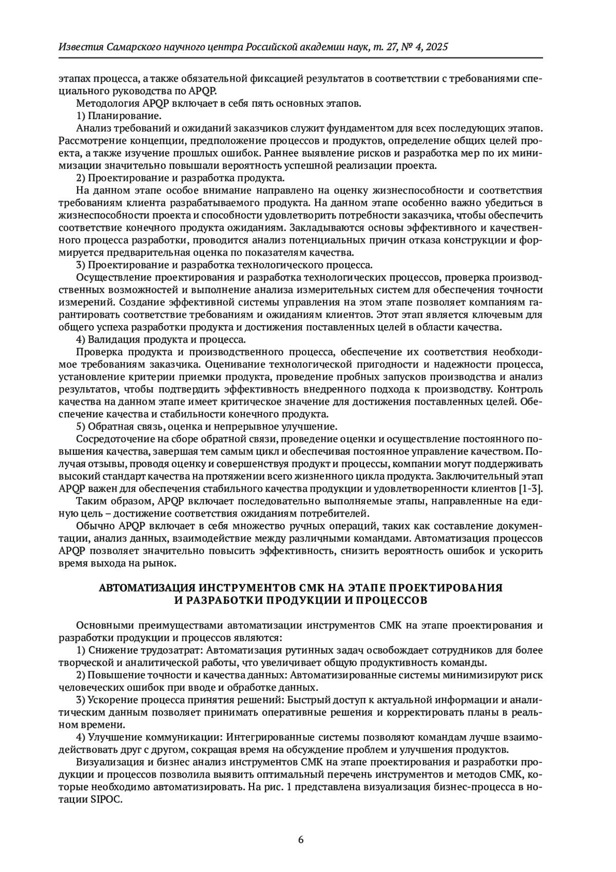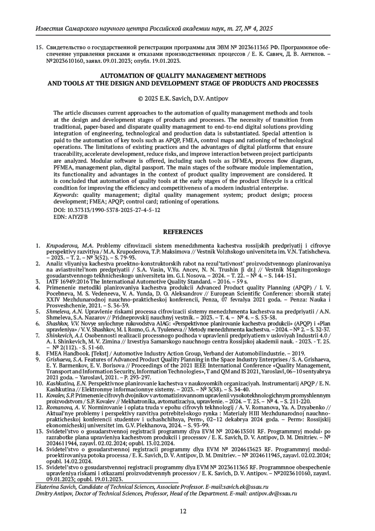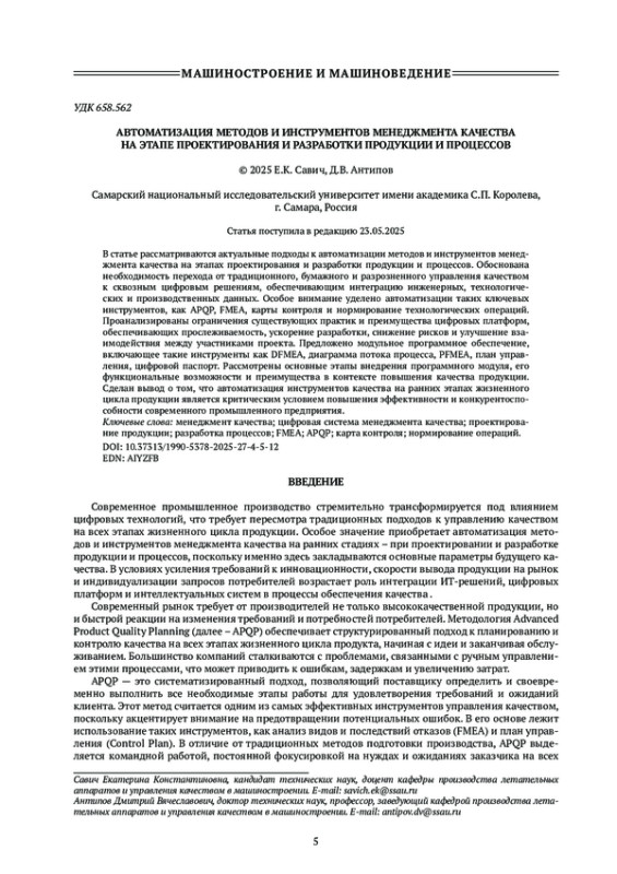 САВИЧ Е. К., АНТИПОВ Д. В. АВТОМАТИЗАЦИЯ МЕТОДОВ И ИНСТРУМЕНТОВ МЕНЕДЖМЕНТА КАЧЕСТВА НА ЭТАПЕ ПРОЕКТИРОВАНИЯ И РАЗРАБОТКИ ПРОДУКЦИИ И ПРОЦЕССОВ // ИЗВЕСТИЯ САМАРСКОГО НАУЧНОГО ЦЕНТРА РОССИЙСКОЙ АКАДЕМИИ НАУК. 2025. Т. 27 № 4 (126)