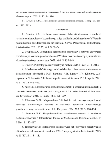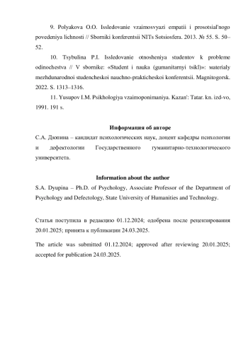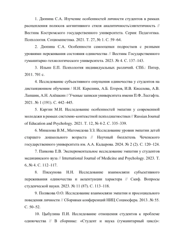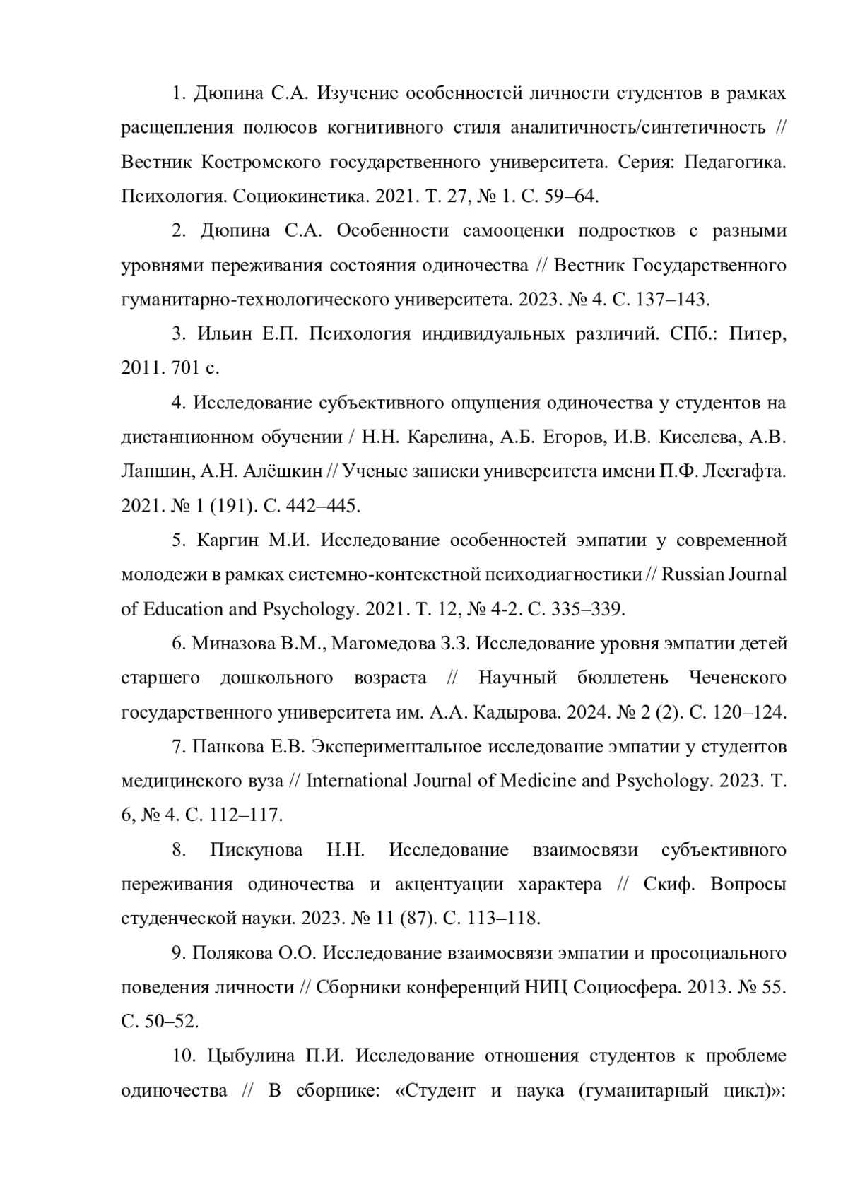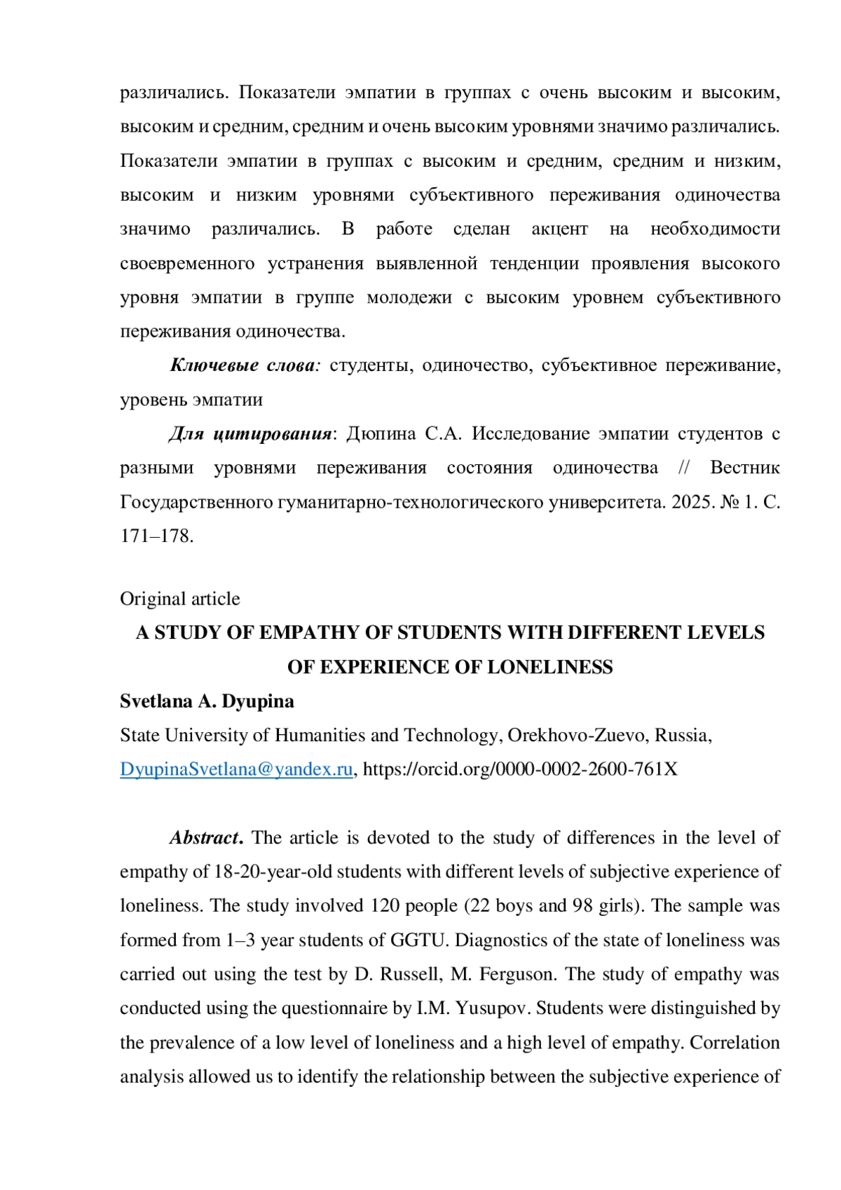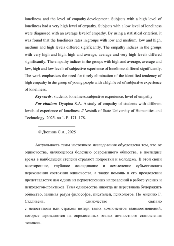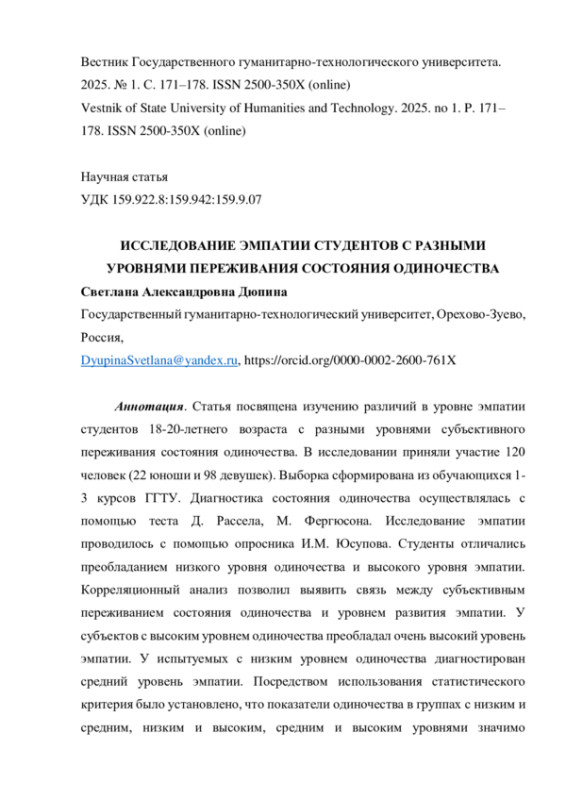 ДЮПИНА С. А. ИССЛЕДОВАНИЕ ЭМПАТИИ СТУДЕНТОВ С РАЗНЫМИ УРОВНЯМИ ПЕРЕЖИВАНИЯ СОСТОЯНИЯ ОДИНОЧЕСТВА // ВЕСТНИК ГОСУДАРСТВЕННОГО ГУМАНИТАРНО-ТЕХНОЛОГИЧЕСКОГО УНИВЕРСИТЕТА. 2025. № 1