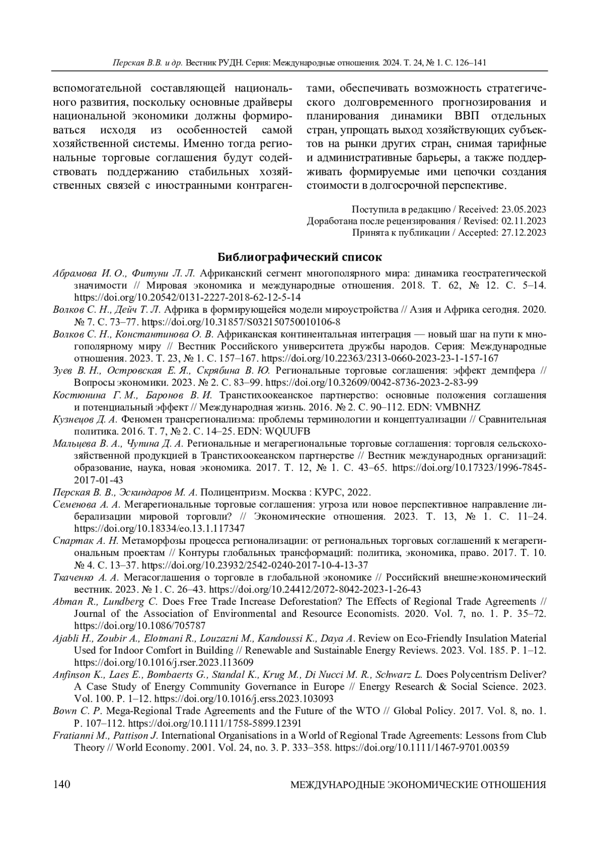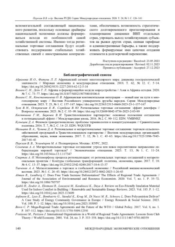3. Волков С. Н., Константинова О. В. Африканская континентальная интеграция - новый шаг на пути к многополярному миру // Вестник Российского университета дружбы народов. Серия: Международные отношения. 2023. Т. 23, № 1. С. 157-167. DOI: 10.22363/2313-0660-2023-23-1-157-167 EDN: THCCVS