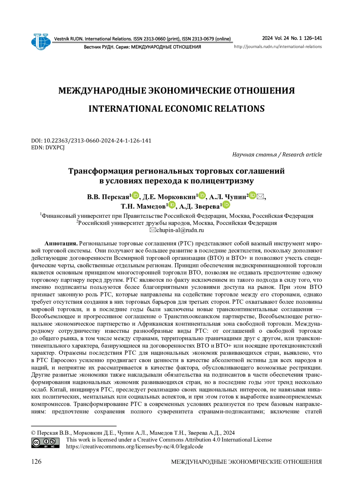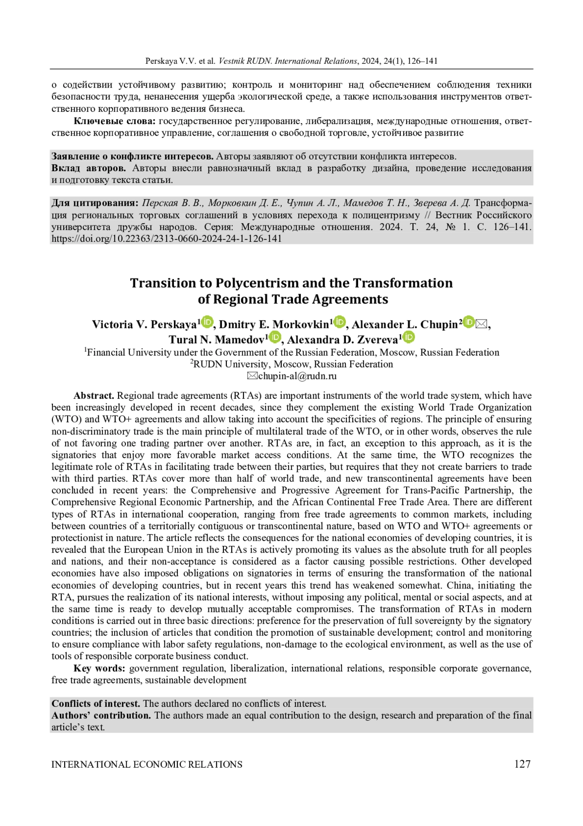 Региональные торговые соглашения (РТС) представляют собой важный инструмент мировой торговой системы. Они получают все большее развитие в последние десятилетия, поскольку дополняют действующие договоренности Всемирной торговой организации (ВТО) и ВТО+ и позволяют учесть специфические черты, свойственные отдельным регионам. Принцип обеспечения недискриминационной торговли является основным принципом многосторонней торговли ВТО, позволяя не отдавать предпочтение одному торговому партнеру перед другим. РТС являются по факту исключением из такого подхода в силу того, что именно подписанты пользуются более благоприятными условиями доступа на рынок. При этом ВТО признает законную роль РТС, которые направлены на содействие торговле между его сторонами, однако требует отсутствия создания в них торговых барьеров для третьих сторон. РТС охватывают более половины мировой торговли, и в последние годы были заключены новые трансконтинентальные соглашения - Всеобъемлющее и прогрессивное соглашение о Транстихоокеанском партнерстве, Всеобъемлющее региональное экономическое партнерство и Африканская континентальная зона свободной торговли. Международному сотрудничеству известны разнообразные виды РТС: от соглашений о свободной торговле до общего рынка, в том числе между странами, территориально граничащими друг с другом, или трансконтинентального характера, базирующиеся на договоренностях ВТО и ВТО+ или носящие протекционистский характер. Отражены последствия РТС для национальных экономик развивающихся стран, выявлено, что в РТС Евросоюз усиленно продвигает свои ценности в качестве абсолютной истины для всех народов и наций, и неприятие их рассматривается в качестве фактора, обусловливающего возможные рестрикции. Другие развитые экономики также накладывали обязательства на подписантов в части обеспечения трансформирования национальных экономик развивающихся стран, но в последние годы этот тренд несколько ослаб. Китай, инициируя РТС, преследует реализацию своих национальных интересов, не навязывая никаких политических, ментальных или социальных аспектов, и при этом готов к выработке взаимоприемлемых компромиссов. Трансформирование РТС в современных условиях реализуется по трем базовым направлениям: предпочтение сохранения полного суверенитета странами-подписантами; включение статей о содействии устойчивому развитию; контроль и мониторинг над обеспечением соблюдения техники безопасности труда, ненанесения ущерба экологической среде, а также использования инструментов ответственного корпоративного ведения бизнеса.