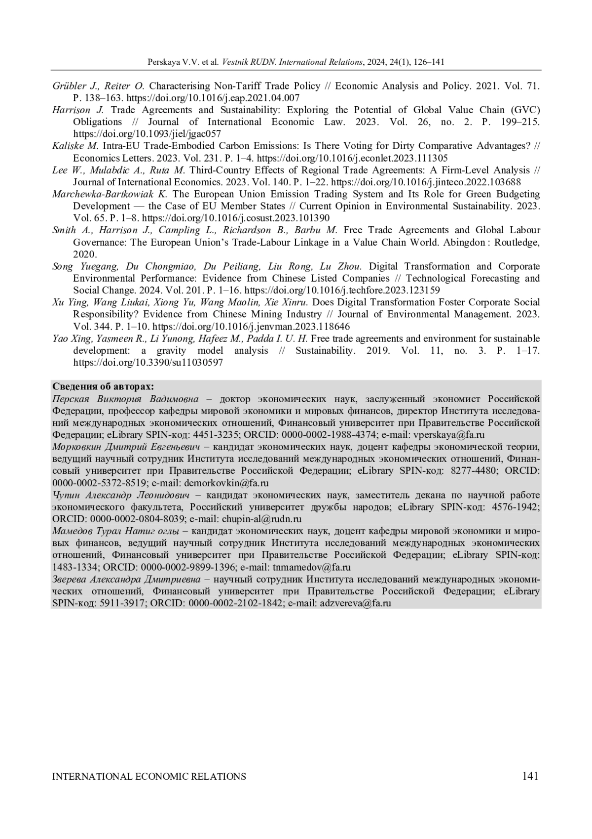 19. Kaliske M. Intra-EU Trade-Embodied Carbon Emissions: Is There Voting for Dirty Comparative Advantages? // Economics Letters. 2023. Vol. 231. P. 1-4. DOI: 10.1016/j.econlet.2023.111305 EDN: OPTSHO