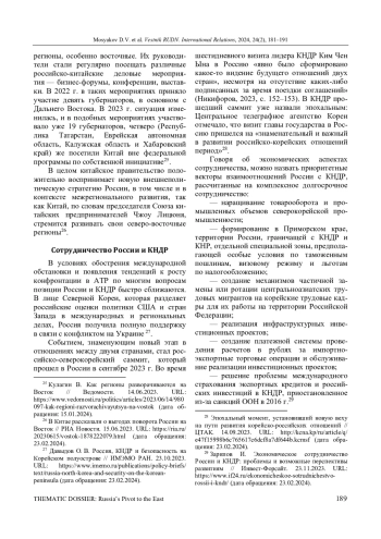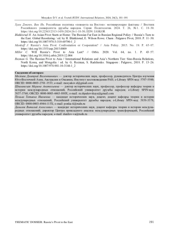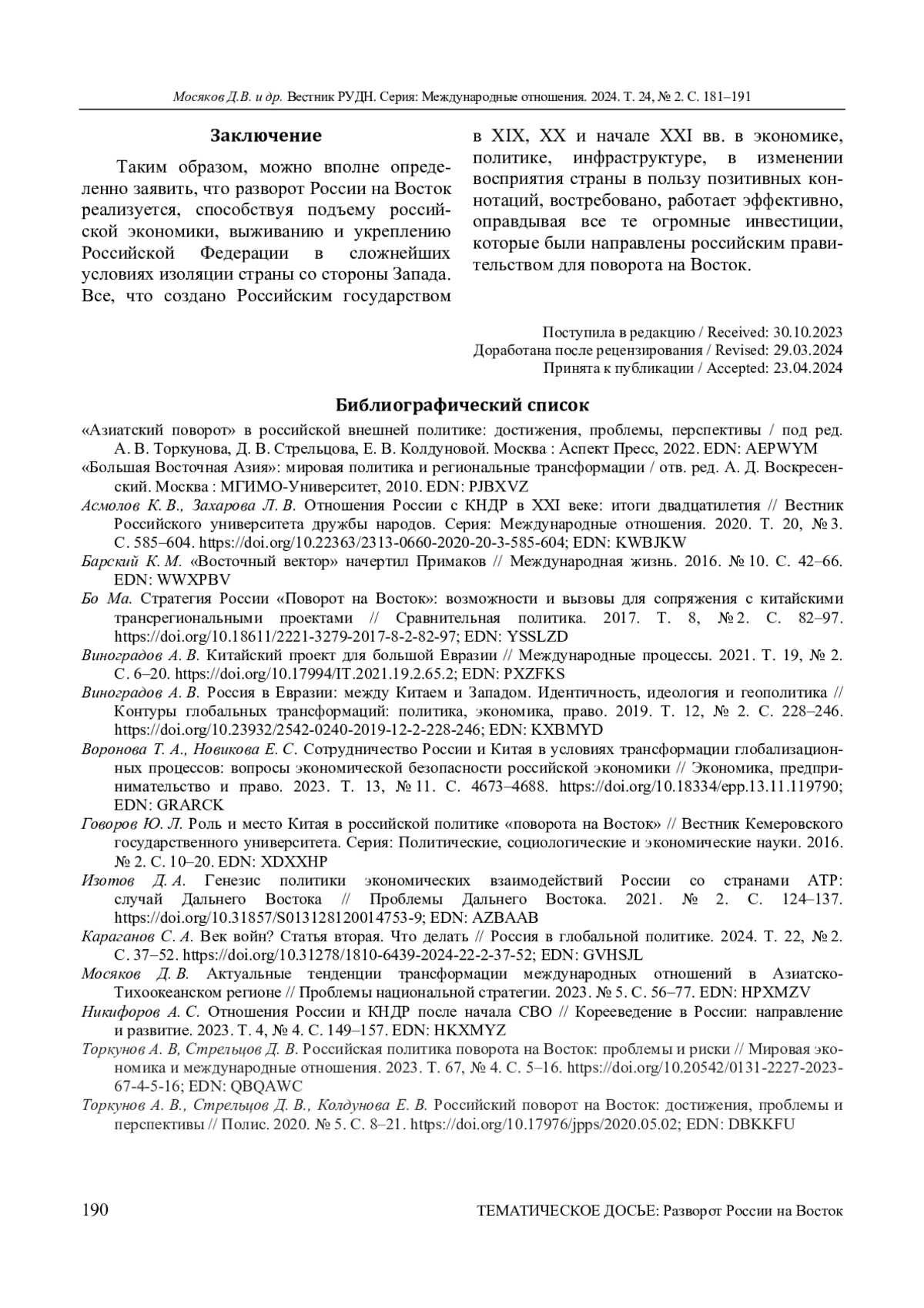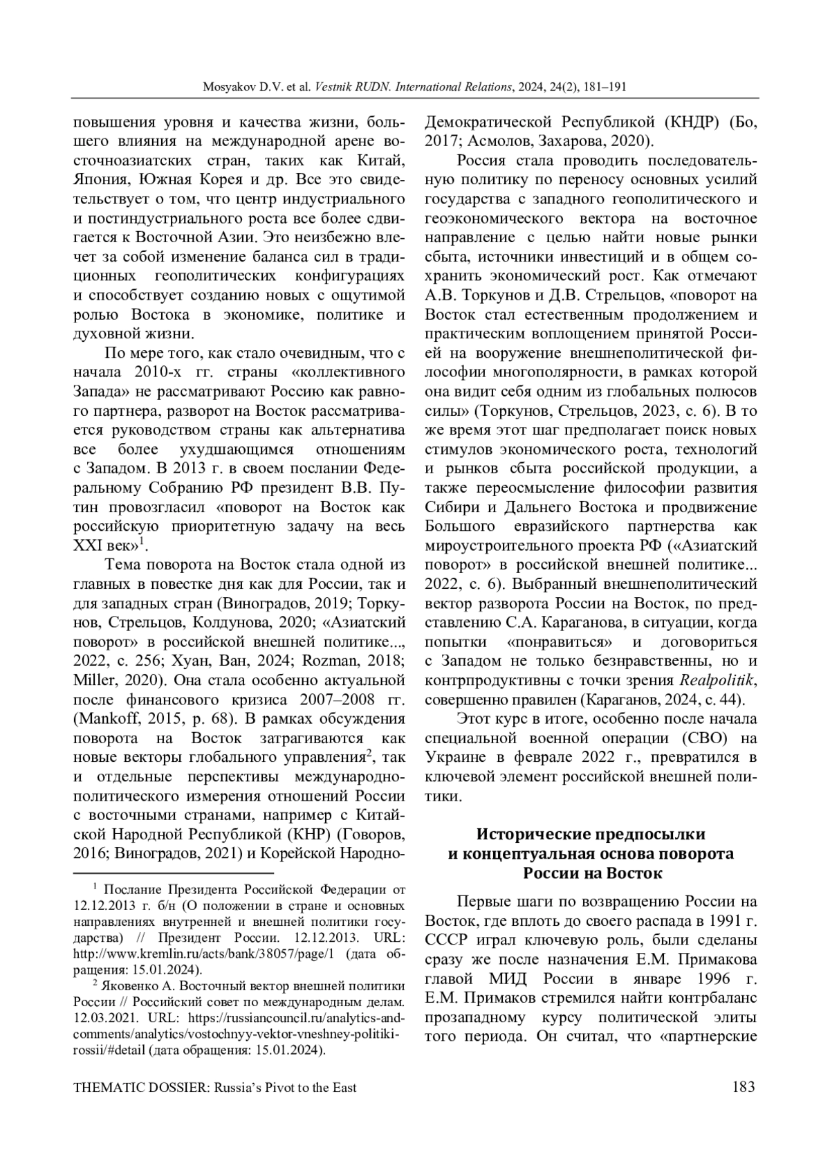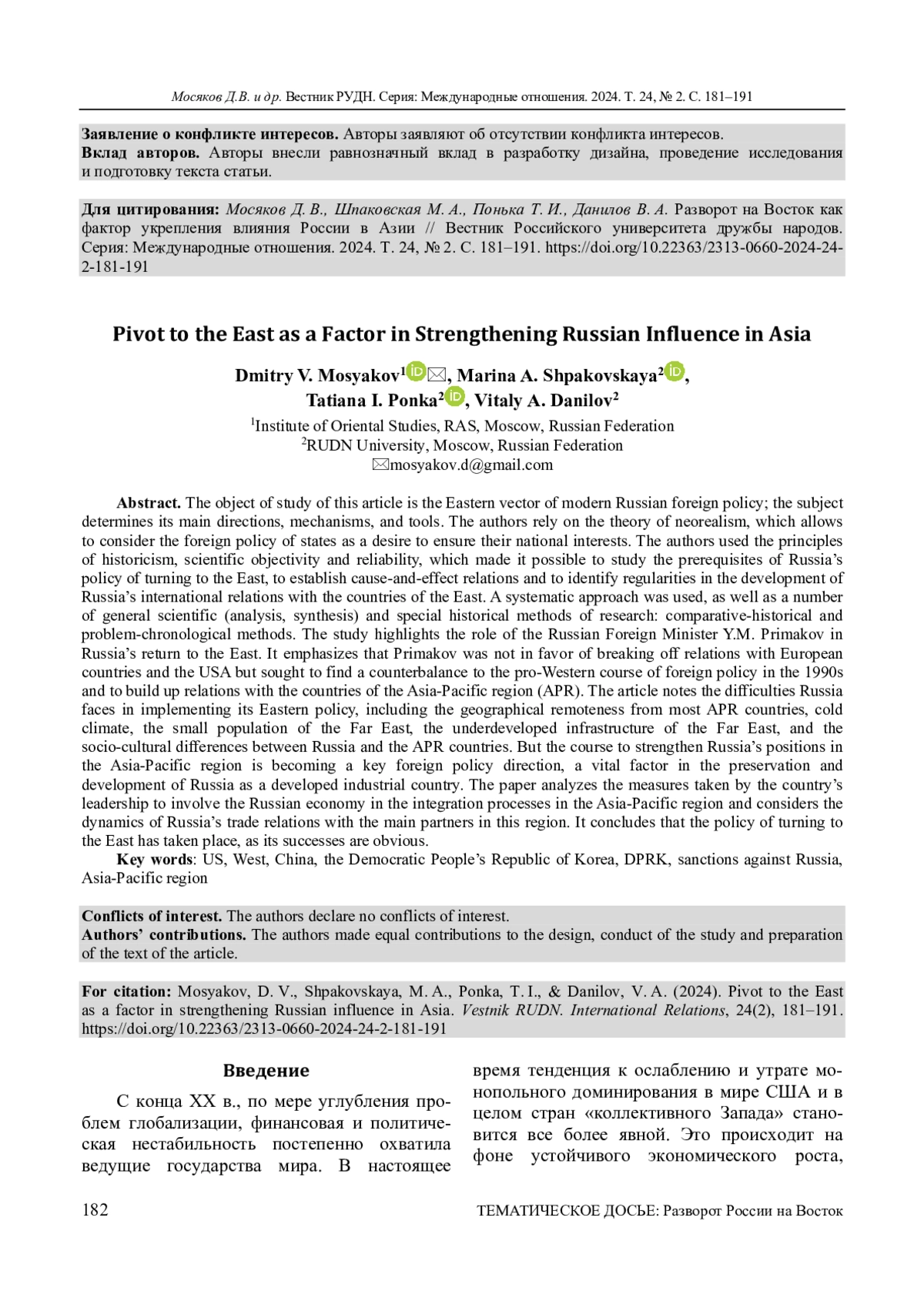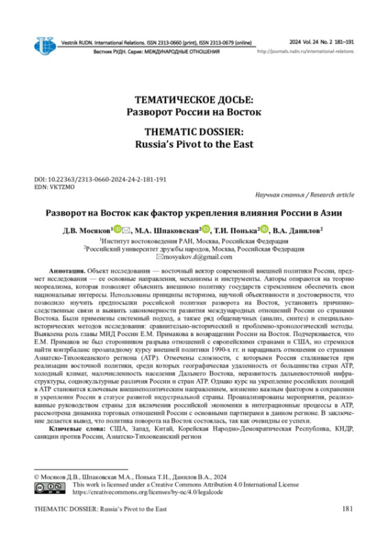 МОСЯКОВ Д. В., ШПАКОВСКАЯ М. А., ПОНЬКА Т. И., ДАНИЛОВ В. А. РАЗВОРОТ НА ВОСТОК КАК ФАКТОР УКРЕПЛЕНИЯ ВЛИЯНИЯ РОССИИ В АЗИИ // ВЕСТНИК РОССИЙСКОГО УНИВЕРСИТЕТА ДРУЖБЫ НАРОДОВ. СЕРИЯ: МЕЖДУНАРОДНЫЕ ОТНОШЕНИЯ. 2024. ТОМ 24 № 2