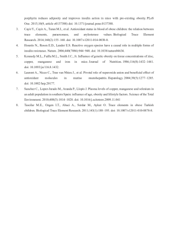3. Cayir Y., Cayir A., Turan M.I., et al. Antioxidant status in blood of obese children: the relation between trace elements, paraoxonase, and arylesterase values. Biological Trace Element Research. 2014;160(2):155-160. DOI: 10.1007/s12011-014-0038-0 EDN: HWAXGX