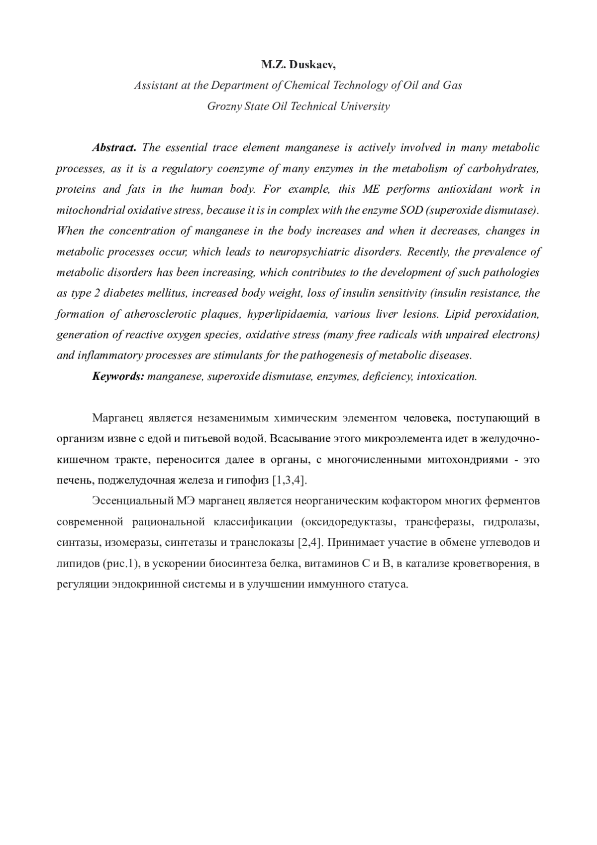 Эссенциальный микроэлемент - марганец, принимает активное участие во многих обменных процессах, поскольку является регуляторным коферментом многих энзимов в процессах обмена углеводов, белков и жиров в организме человека. Например, данный МЭ выполняет антиоксидантную работу при митохондриальном окислительном стрессе, поскольку находится в комплексе с ферментом СОД (супероксиддисмутаза). При повышении и при понижении концентрации в организме марганца происходят изменения в обменных процессах, что и приводят к нервно-психическим расстройствам. В последнее время увеличивается распространенность нарушения метаболизма, что способствует развитию таких патологий, как сахарный диабет 2 типа, увеличение массы тела, потеря чувствительности к инсулину (инсулинорезистентность, образование атеросклеротических бляшек, гиперлипидемию, разные поражения печени. Перекисное окисление липидов, генерация реактивных форм кислорода, оксидативный стресс (много свободных радикалов с неспаренными электронами) и воспалительные процессы являются стимуляторами для патогенеза заболеваний обмена веществ.