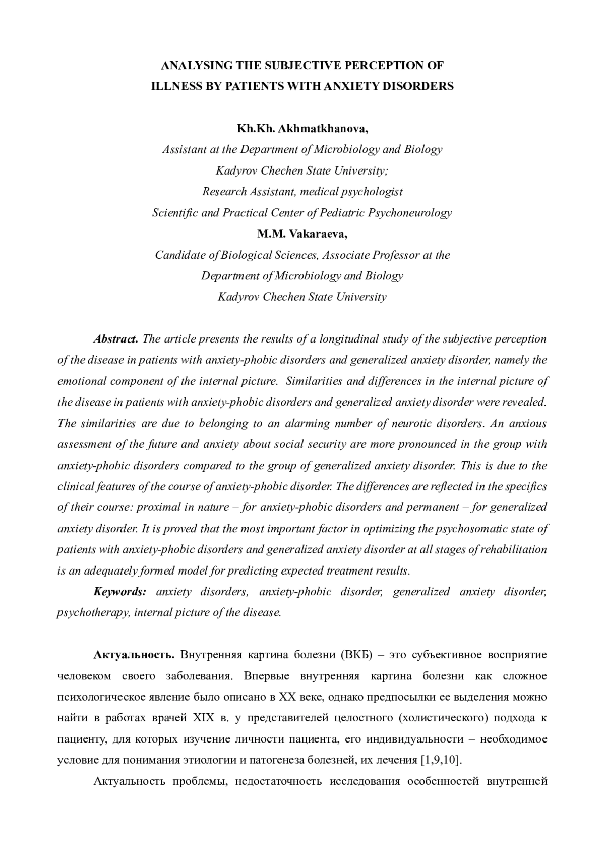 АХМАТХАНОВА Х. Х., ВАКАРАЕВА М.М. АНАЛИЗ СУБЪЕКТИВНОГО ВОСПРИЯТИЯ БОЛЕЗНИ ПАЦИЕНТАМИ С ТРЕВОЖНЫМИ РАССТРОЙСТВАМИ // ВЕСТНИК МЕДИЦИНСКОГО ИНСТИТУТА. 2024. № 1 (25)