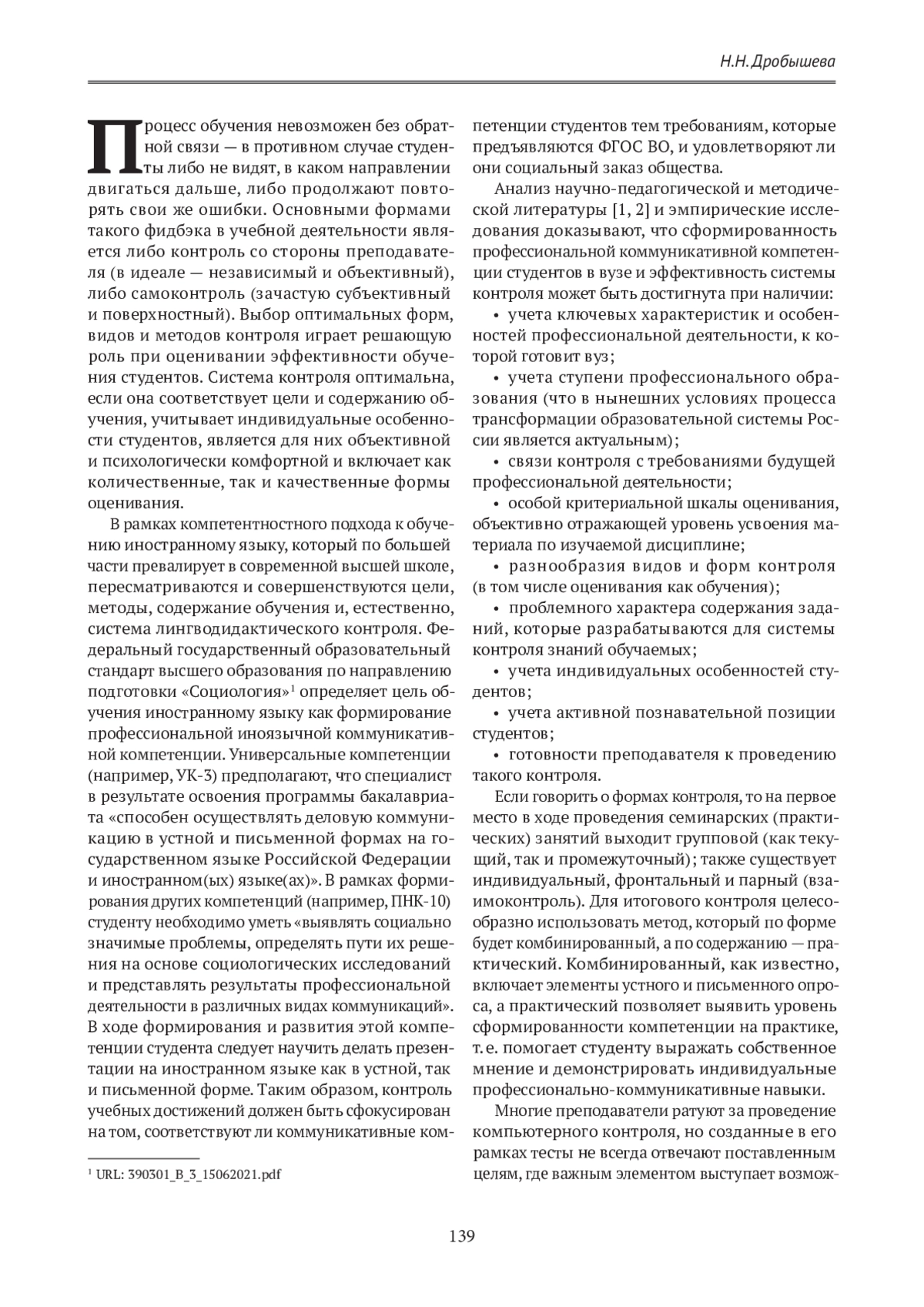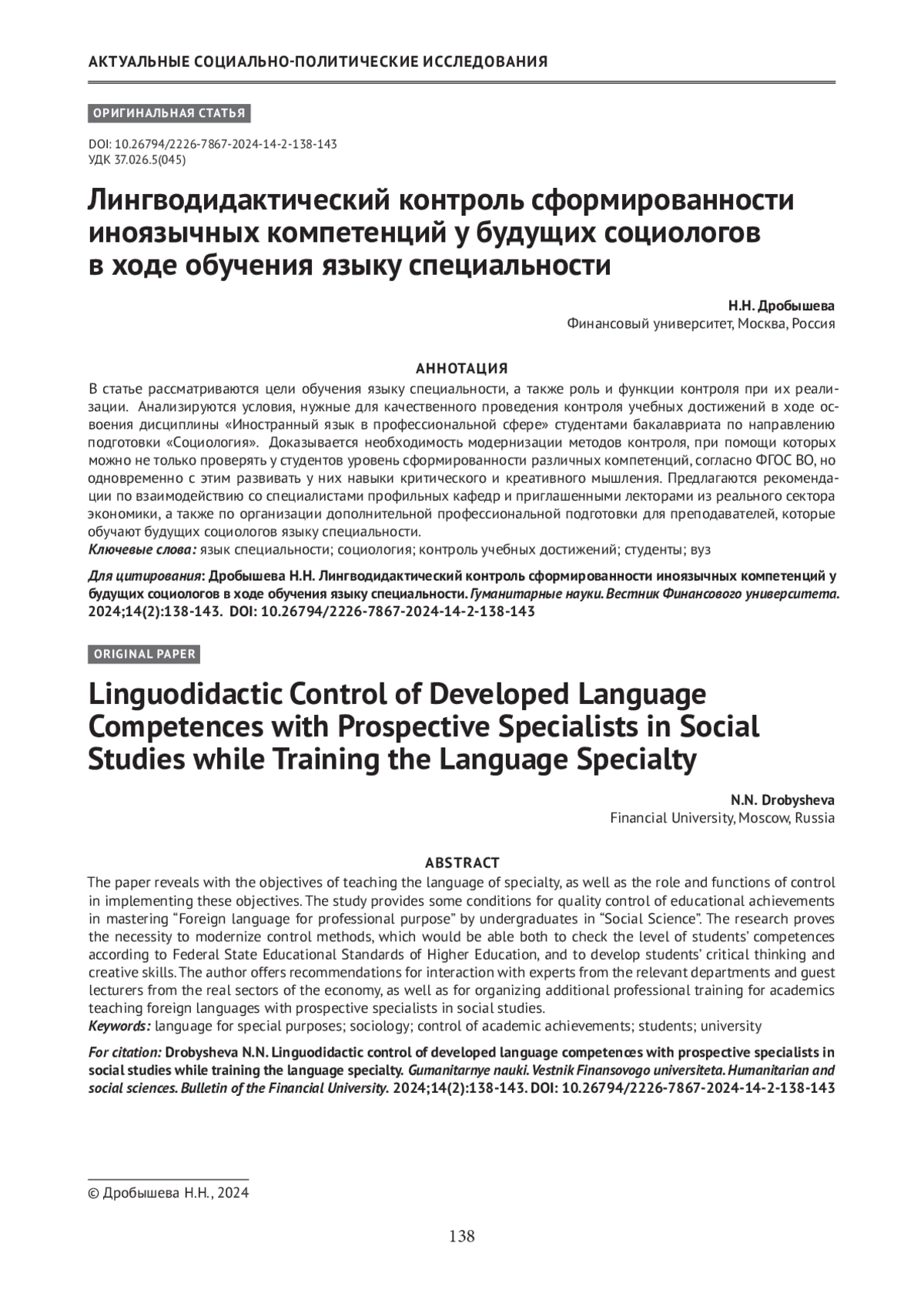 ДРОБЫШЕВА Н. Н. ЛИНГВОДИДАКТИЧЕСКИЙ КОНТРОЛЬ СФОРМИРОВАННОСТИ ИНОЯЗЫЧНЫХ КОМПЕТЕНЦИЙ У БУДУЩИХ СОЦИОЛОГОВ В ХОДЕ ОБУЧЕНИЯ ЯЗЫКУ СПЕЦИАЛЬНОСТИ // ГУМАНИТАРНЫЕ НАУКИ. ВЕСТНИК ФИНАНСОВОГО УНИВЕРСИТЕТА. 2024. ТОМ 14, № 2