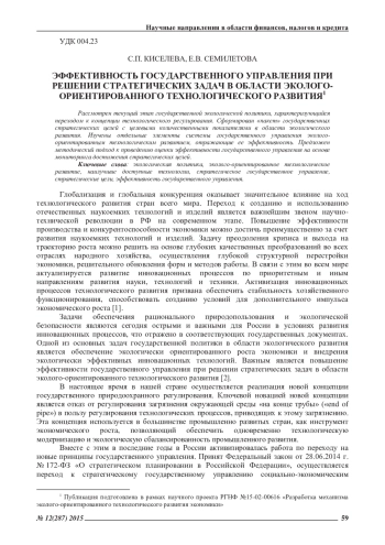 Рассмотрен текущий этап государственной экологической политики, характеризующийся переходом к концепции технологического регулирования. Сформирован «пакет» государственных стратегических целей c целевыми количественными показателями в области экологического развития. Изучены отдельные элементы системы государственного управления экологоориентированным технологическим развитием, отражающие ее эффективность. Предложен методический подход к проведению оценки эффективности государственного управления на основе мониторинга достижения стратегических целей