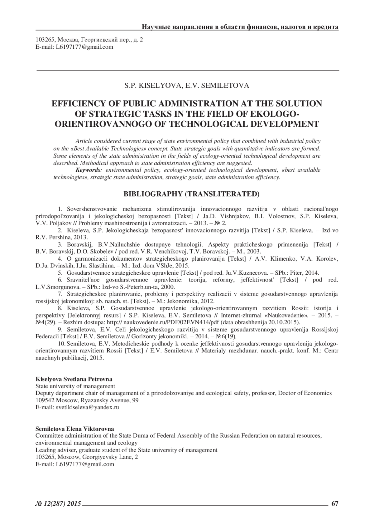 10. Семилетова, Е.В. Методические подходы к оценке эффективности государственного управления эколого-ориентированным развитием России /Е.В. Семилетова//Материалы междунар. науч.-практ. конф. М.: Центр научных публикаций, 2015.