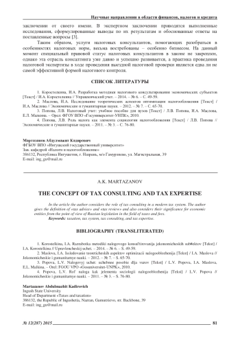1. Коростелкина, И.А. Разработка методики налогового консультирования экономических субъектов [Текст] / И.А. Коростелкина // Управленческий учет. - 2014. - № 6. - С. 49-59. EDN: SEJOXV