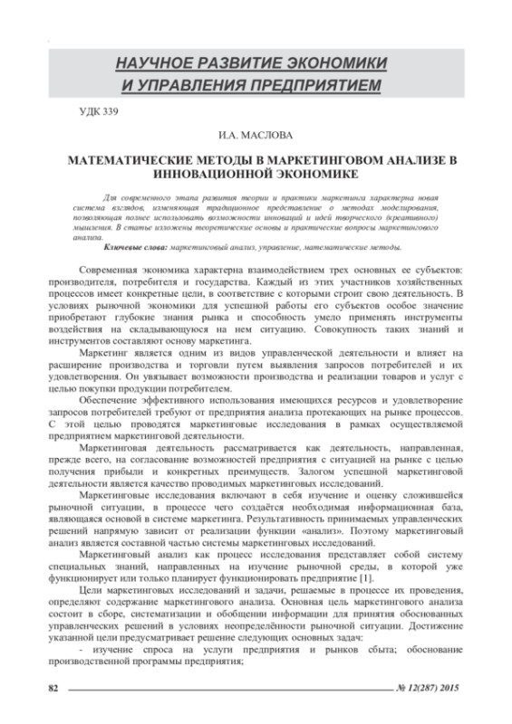 Для современного этапа развития теории и практики маркетинга характерна новая система взглядов, изменяющая традиционное представление о методах моделирования, позволяющая полнее использовать возможности инноваций и идей творческого (креативного) мышления. В статье изложены теоретические основы и практические вопросы маркетингового анализа.