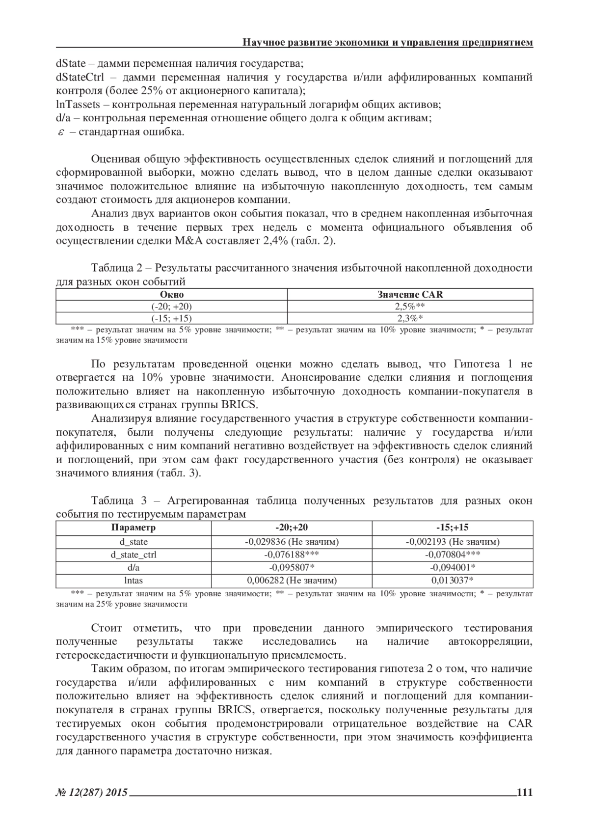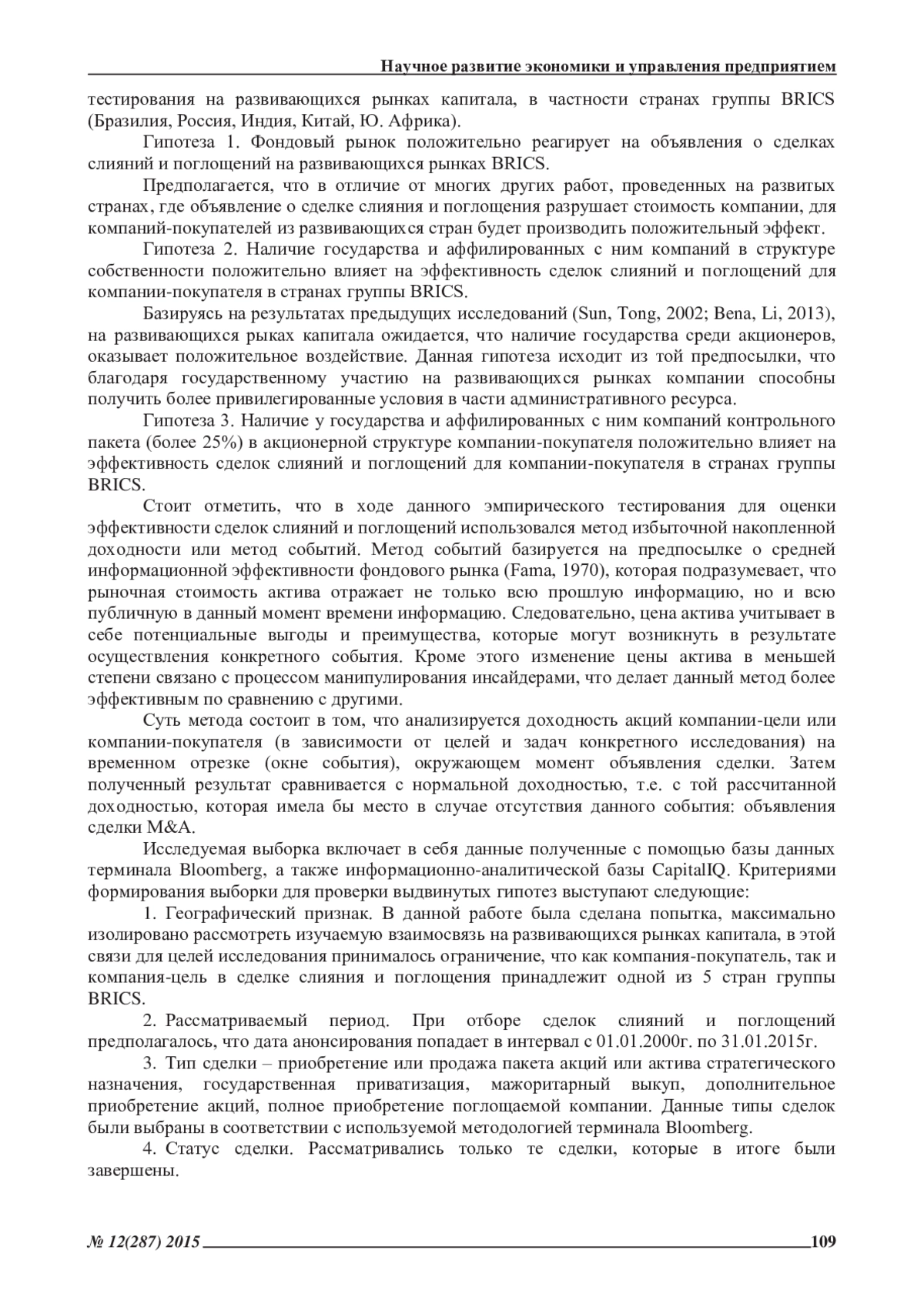 Сделки слияний и поглощений являются значимым корпоративным событием для компании. В данной работе представлены результаты анализа эффективности осуществленных сделок слияний и поглощений на развивающихся рынках капитала. Основываясь на методе событий, было доказано, что сделки по передаче корпоративного контроля разрушают стоимость для акционеров компаний-покупателей и сделан вывод о негативном влиянии на эффективность сделок слияний и поглощений государственного участия в акционерной структуре собственности.