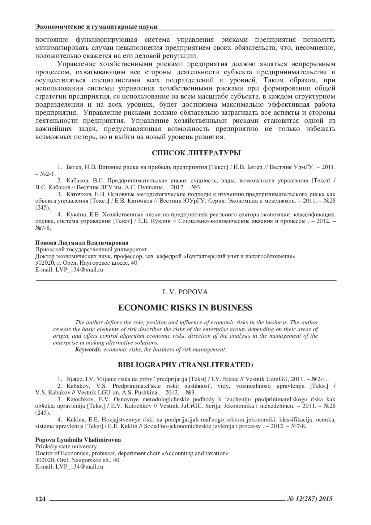 4. Кукина, Е.Е. Хозяйственные риски на предприятиях реального сектора экономики: классификация, оценка, система управления [Текст] / Е.Е. Куклин // Социально-экономические явления и процессы. - 2012. - №7-8. EDN: PZRTAD