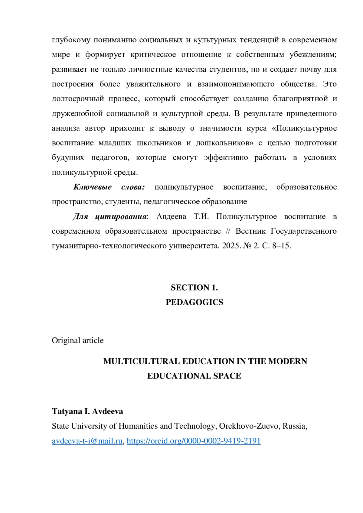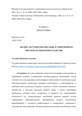 АВДЕЕВА Т. И. ПОЛИКУЛЬТУРНОЕ ВОСПИТАНИЕ В СОВРЕМЕННОМ ОБРАЗОВАТЕЛЬНОМ ПРОСТРАНСТВЕ // ВЕСТНИК ГОСУДАРСТВЕННОГО ГУМАНИТАРНО-ТЕХНОЛОГИЧЕСКОГО УНИВЕРСИТЕТА. 2025. № 2