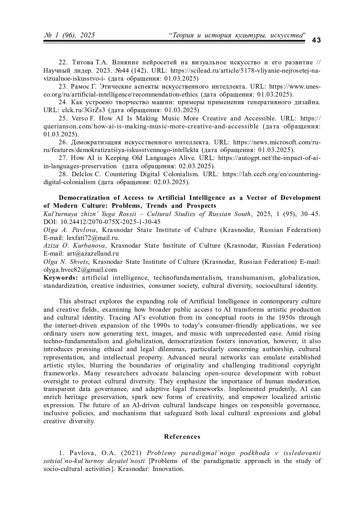 ПАВЛОВА О. А., КУРБАНОВА А. О., ШВЕЦ О. Н. ДЕМОКРАТИЗАЦИЯ ДОСТУПА К ИСКУССТВЕННОМУ ИНТЕЛЛЕКТУ КАК ВЕКТОР РАЗВИТИЯ СОВРЕМЕННОЙ КУЛЬТУРЫ: ПРОБЛЕМЫ, ТЕНДЕНЦИИ И ПЕРСПЕКТИВЫ // КУЛЬТУРНАЯ ЖИЗНЬ ЮГА РОССИИ. 2025. № 1 (96)