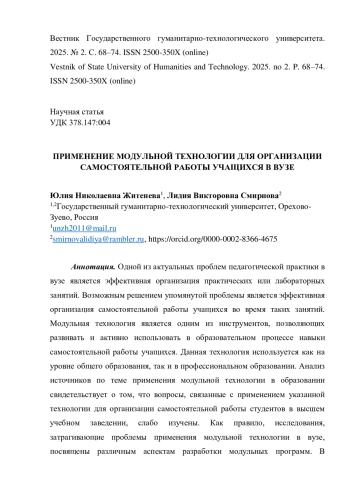 Одной из актуальных проблем педагогической практики в вузе является эффективная организация практических или лабораторных занятий. Возможным решением упомянутой проблемы является эффективная организация самостоятельной работы учащихся во время таких занятий. Модульная технология является одним из инструментов, позволяющих развивать и активно использовать в образовательном процессе навыки самостоятельной работы учащихся. Данная технология используется как на уровне общего образования, так и в профессиональном образовании. Анализ источников по теме применения модульной технологии в образовании свидетельствует о том, что вопросы, связанные с применением указанной технологии для организации самостоятельной работы студентов в высшем учебном заведении, слабо изучены. Как правило, исследования, затрагивающие проблемы применения модульной технологии в вузе, посвящены различным аспектам разработки модульных программ. В предлагаемой статье описан опыт практического применения модульной технологии на ступени высшего образования для решения проблемы эффективной организации самостоятельной работы учащихся. На примере практического занятия, проведенного со студентами физико-математического факультета, обучающимися по направлению «Педагогическое образование», показан один из возможных вариантов применения модульной технологии при изучении дисциплины «Технологии цифрового образования». Проведенные исследования позволяют сделать вывод о том, что применение модульной технологии обеспечивает рациональную организацию аудиторной самостоятельной работы учащихся в вузе, позволяет индивидуализировать обучение.