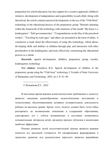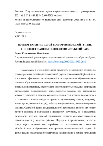 Статья: РЕЧЕВОЕ РАЗВИТИЕ ДЕТЕЙ ПОДГОТОВИТЕЛЬНОЙ ГРУППЫ С ИСПОЛЬЗОВАНИЕМ ТЕХНОЛОГИИ «КЛУБНЫЙ ЧАС» (2025)