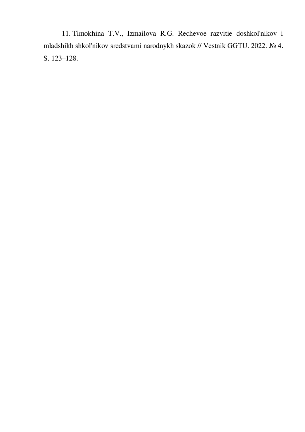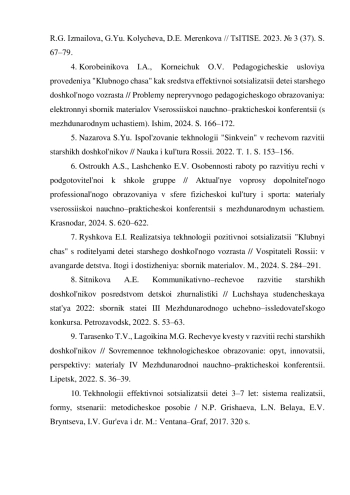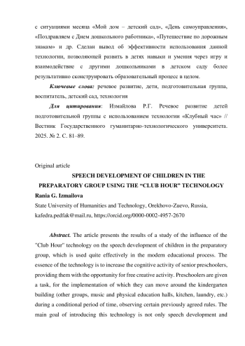 ИЗМАЙЛОВА Р. Г. РЕЧЕВОЕ РАЗВИТИЕ ДЕТЕЙ ПОДГОТОВИТЕЛЬНОЙ ГРУППЫ С ИСПОЛЬЗОВАНИЕМ ТЕХНОЛОГИИ «КЛУБНЫЙ ЧАС» // ВЕСТНИК ГОСУДАРСТВЕННОГО ГУМАНИТАРНО-ТЕХНОЛОГИЧЕСКОГО УНИВЕРСИТЕТА. 2025. № 2