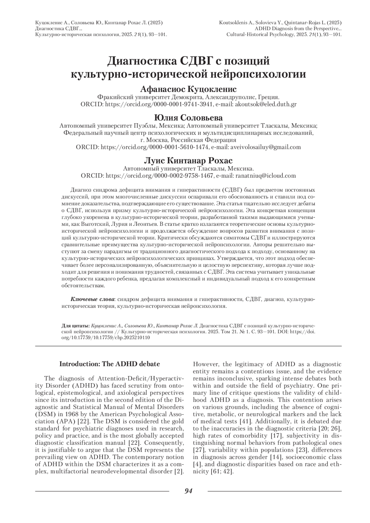 43. Solovieva Y., Koutsoklenis A., Quintanar L. Neuropsychological assessment of difficulties in reading Spanish: A cultural-historical approach. Psychology in Russia: State Art, 2021. Vol.14, no.4, pp.51-65. DOI: 10.11621/pir.2021.0404