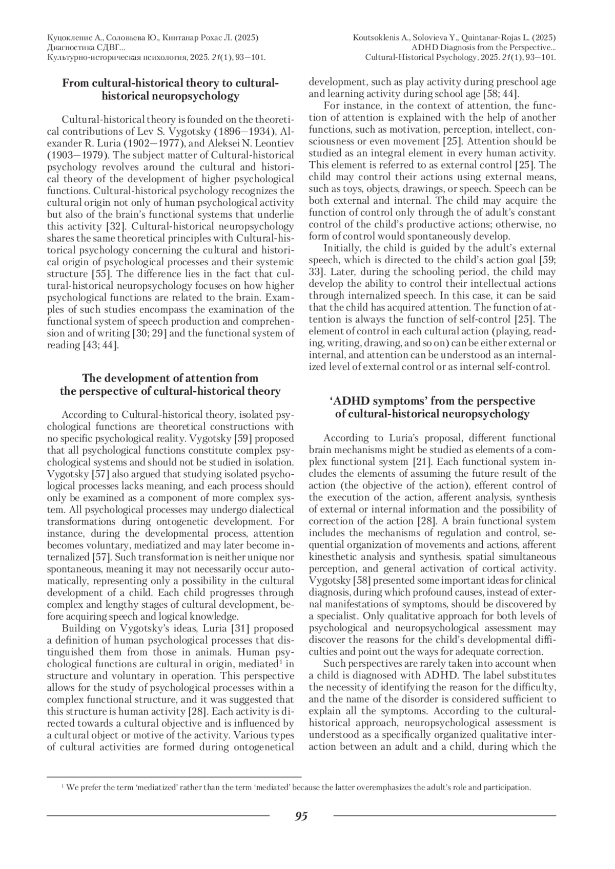 В данной статье предлагается комментарий к статье «Диагностика СДВГ с позиций культурноисторической нейропсихологии». Авторы комментируемой статьи А. Куцокленис, Ю. Соловьева и Л. Кинтанар Рохас решительно выступают за смену парадигмы от традиционного диагностического подхода к культурно-исторической нейропсихологии (КИНП). По мнению авторов, подход с позиций КИНП позволяет отказаться от постановки диагноза СДВГ при диагностике этого синдрома. Авторы предполагают, что такой отказ от промежуточного уровня абстракции (в форме диагноза) в пользу результатов нейропсихологической оценки конкретного ребенка позволит напрямую перейти к персонализированным рекомендациям по коррекционно-развивающей помощи данному ребенку. Несмотря на общность наших исходных теоретических позиций, т. е. принципов культурно-исторической психологии и нейропсихологии, разработанных в трудах Л. С. Выготского и А. Р. Лурии, я не согласна с предлагаемым авторами статьи решением вопроса о диагнозе СДВГ.