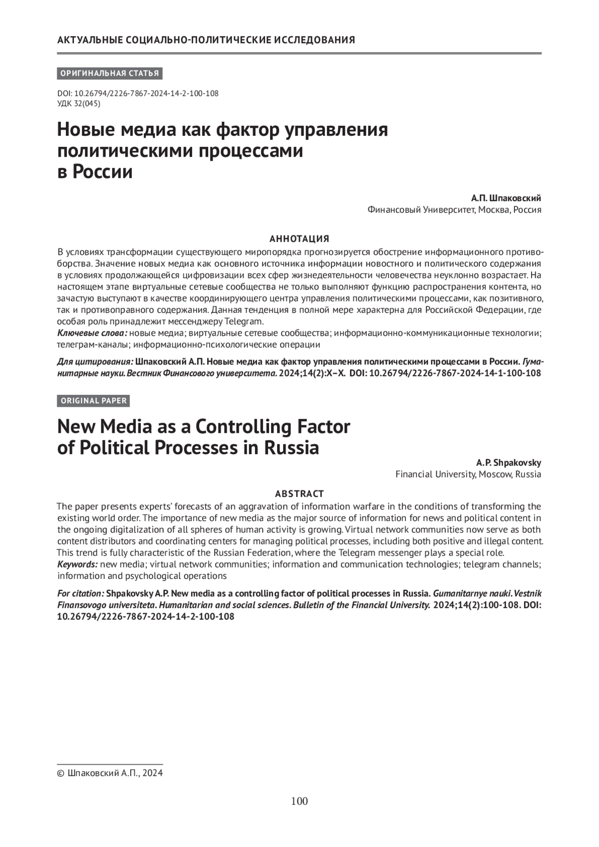 - 10.26794/2226-7867-2024-14-2-100-108