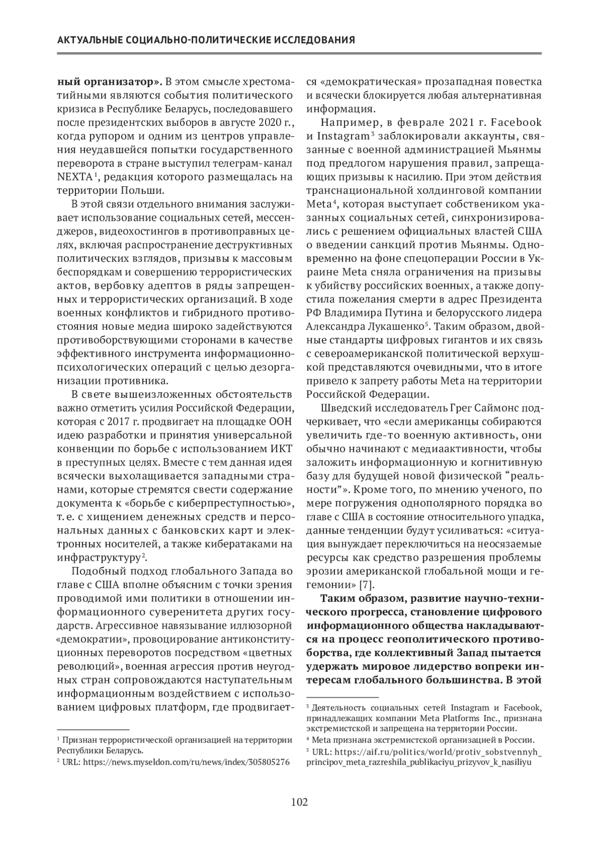 В условиях трансформации существующего миропорядка прогнозируется обострение информационного противоборства. Значение новых медиа как основного источника информации новостного и политического содержания в условиях продолжающейся цифровизации всех сфер жизнедеятельности человечества неуклонно возрастает. На настоящем этапе виртуальные сетевые сообщества не только выполняют функцию распространения контента, но зачастую выступают в качестве координирующего центра управления политическими процессами, как позитивного, так и противоправного содержания. Данная тенденция в полной мере характерна для Российской Федерации, где особая роль принадлежит мессенджеру Telegram.
