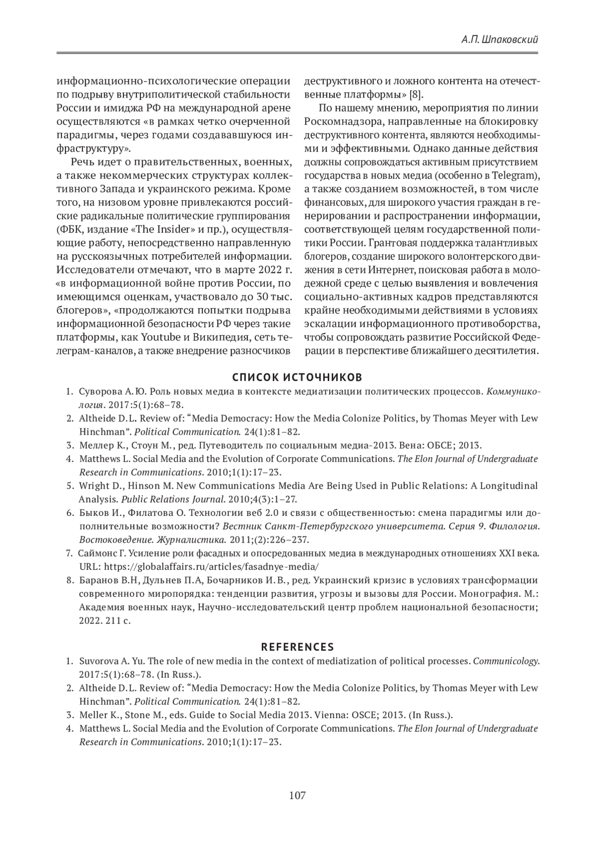 1. Суворова А. Ю. Роль новых медиа в контексте медиатизации политических процессов. Коммуникология. 2017:5(1):68-78.