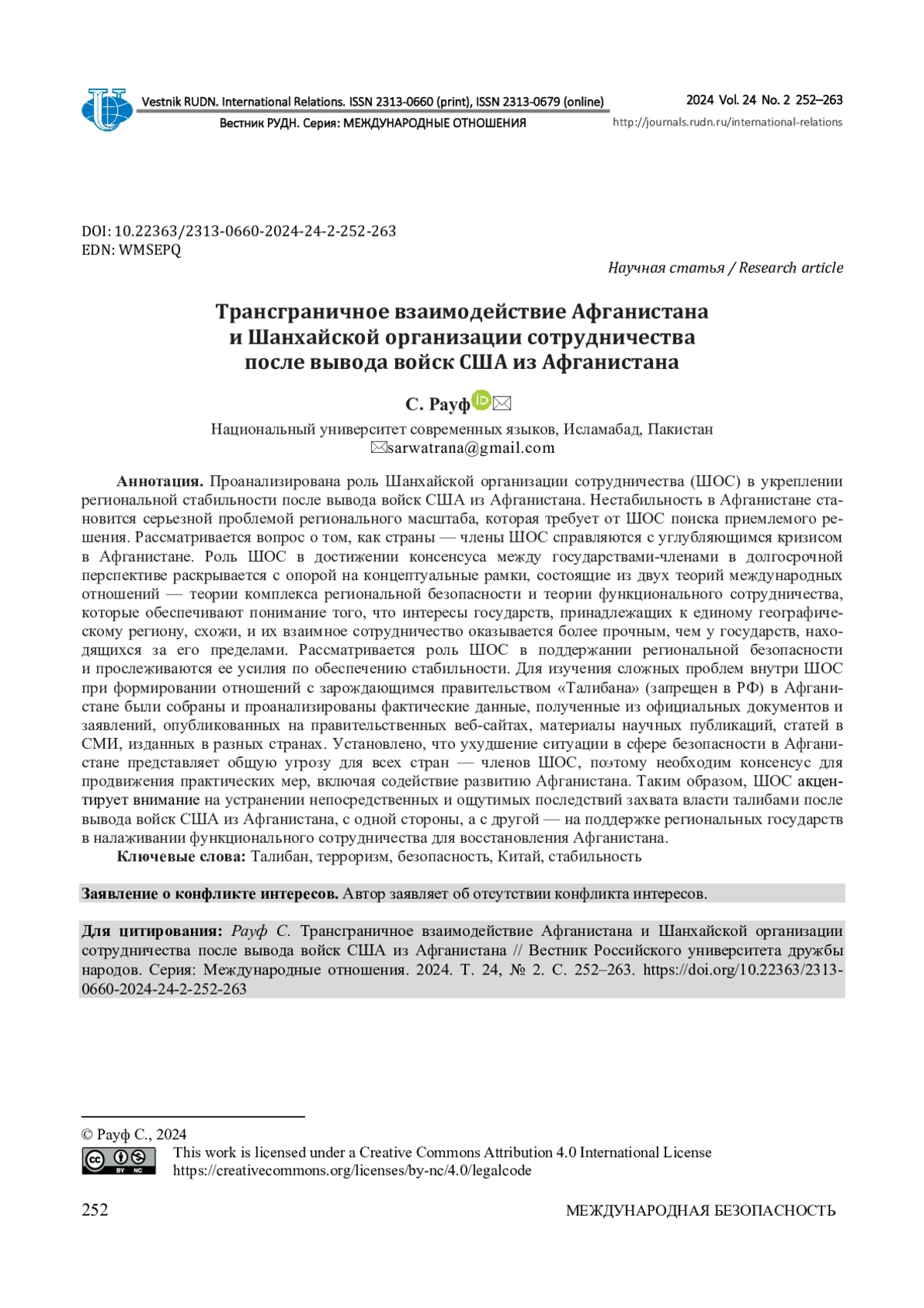 2. Akhtar M. N., Javaid F. The Role of Shanghai Cooperation Organization in the Afghan Crisis // Dealing With Regional Conflicts of Global Importance / ed. by P. Pietrzak. Hershey: IGI Global, 2024. P. 44-62. DOI: 10.4018/978-1-6684-9467-7.ch003