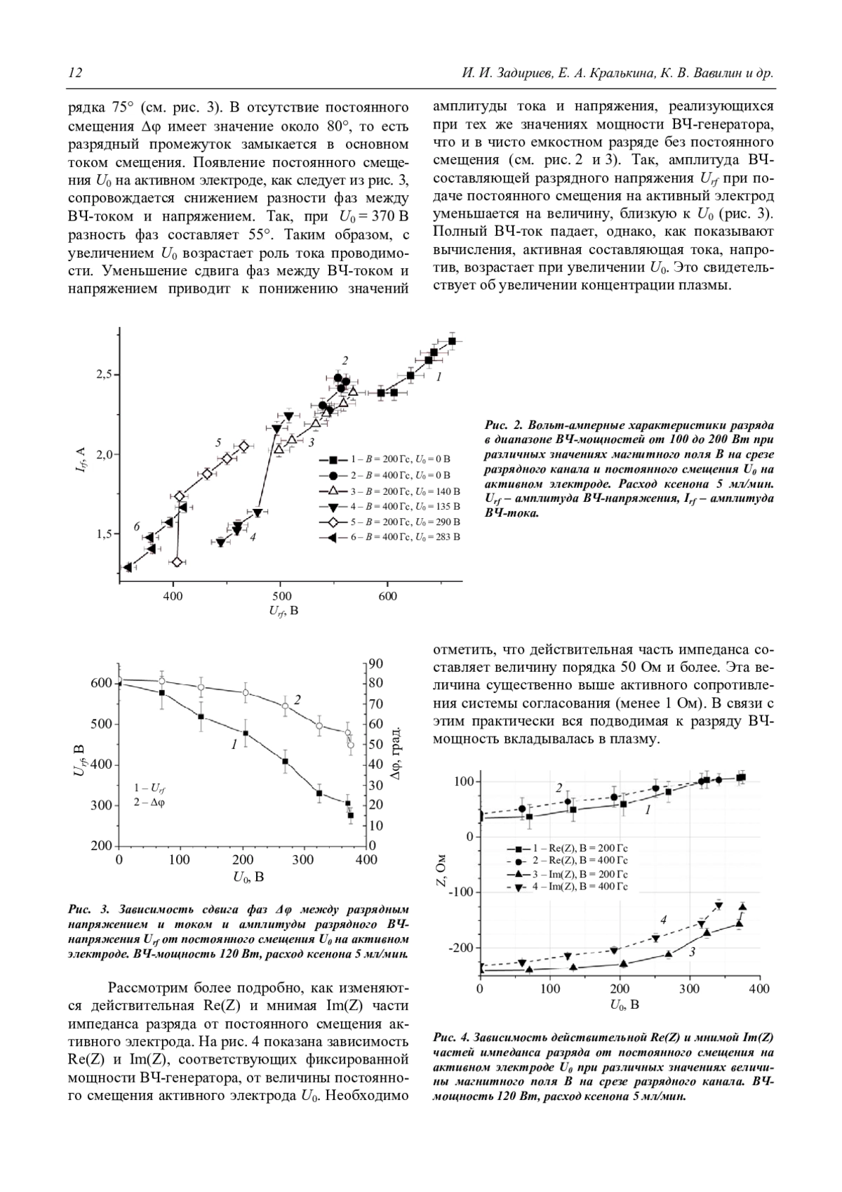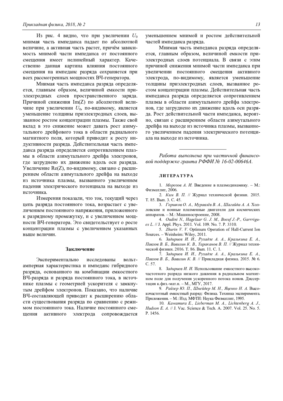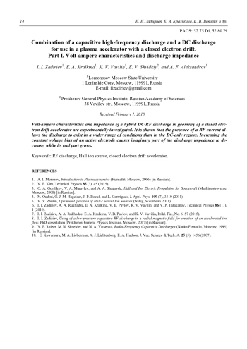 Задириев И. И., Кралькина Е. А., Вавилин К. В., Швыдкий Е. В., Александров А. Ф. Комбинация емкостного высокочастотного разряда и разряда постоянного тока для использования в плазменном ускорителе с замкнутым дрейфом электронов. Часть I. Вольт-амперная характеристика и импеданс разряда 10