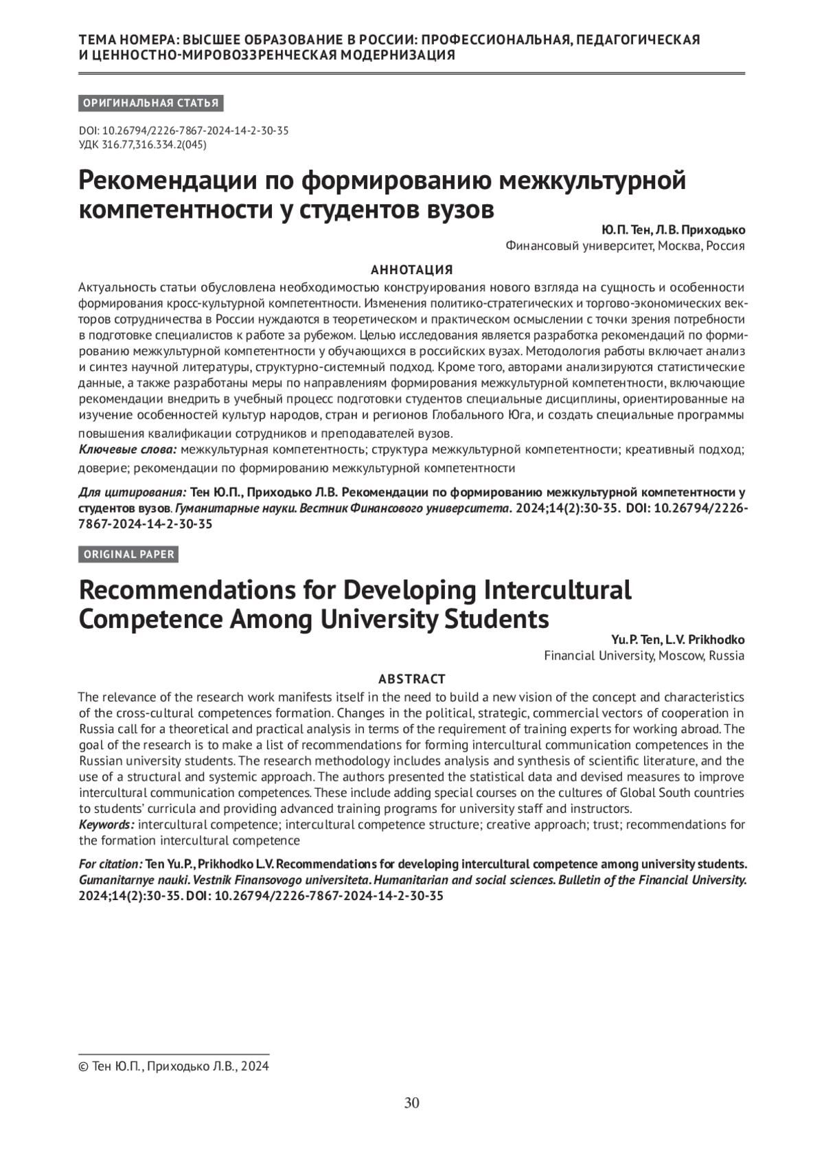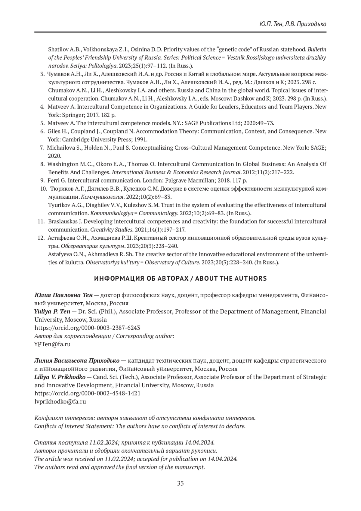 10. Тюриков А. Г., Дягилев В. В., Кулешов С. М. Доверие в системе оценки эффективности межкультурной коммуникации. Коммуникология. 2022;10(2):69-83.