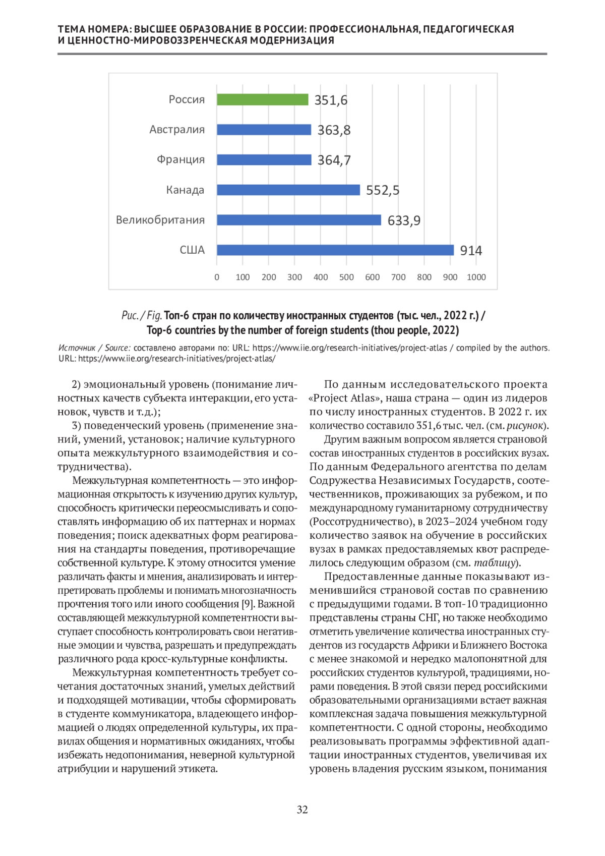 Актуальность статьи обусловлена необходимостью конструирования нового взгляда на сущность и особенности формирования кросс-культурной компетентности. Изменения политико-стратегических и торгово-экономических векторов сотрудничества в России нуждаются в теоретическом и практическом осмыслении с точки зрения потребности в подготовке специалистов к работе за рубежом. Целью исследования является разработка рекомендаций по формированию межкультурной компетентности у обучающихся в российских вузах. Методология работы включает анализ и синтез научной литературы, структурно-системный подход. Кроме того, авторами анализируются статистические данные, а также разработаны меры по направлениям формирования межкультурной компетентности, включающие рекомендации внедрить в учебный процесс подготовки студентов специальные дисциплины, ориентированные на изучение особенностей культур народов, стран и регионов Глобального Юга, и создать специальные программы повышения квалификации сотрудников и преподавателей вузов.