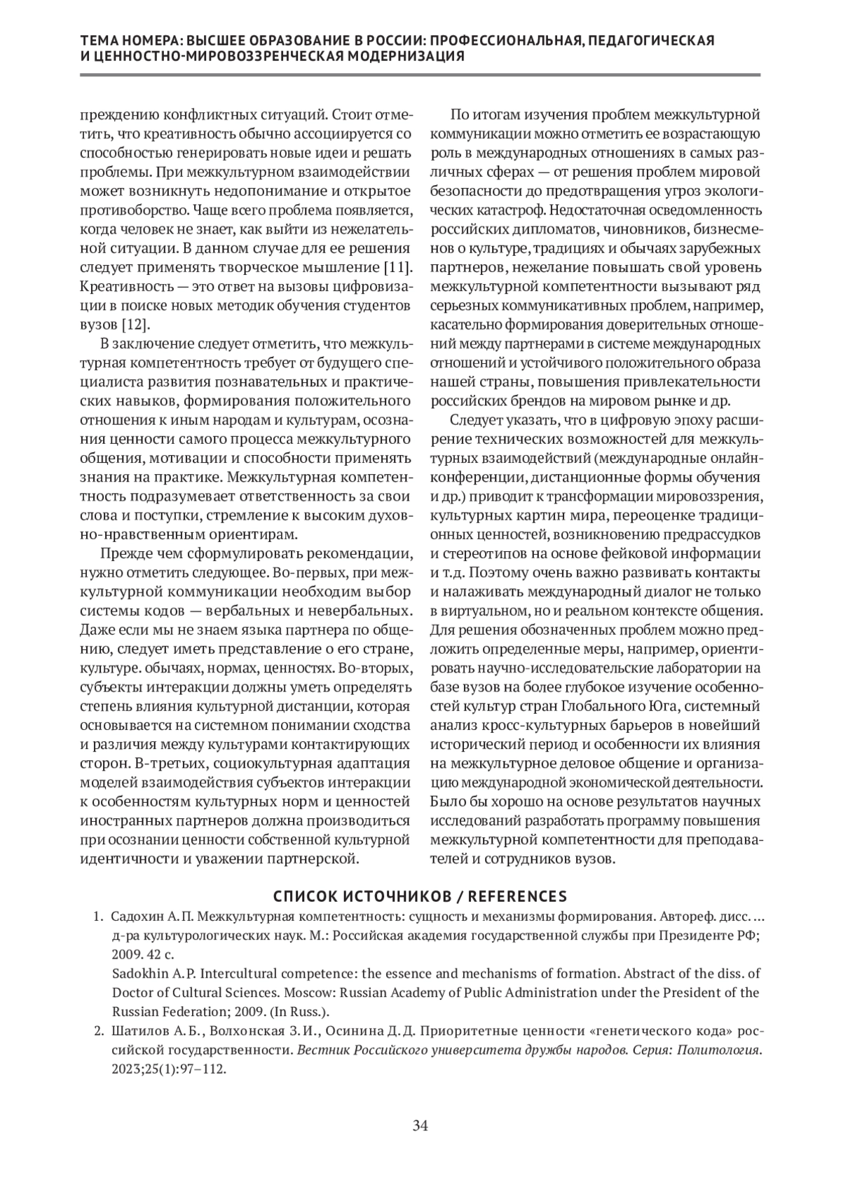 1. Садохин А. П. Межкультурная компетентность: сущность и механизмы формирования. Автореф. дисс. … д-ра культурологических наук. М.: Российская академия государственной службы при Президенте РФ; 2009. 42 с.