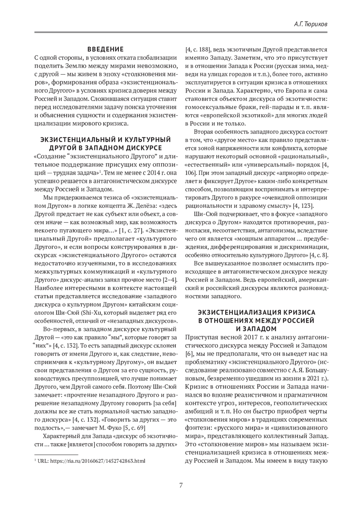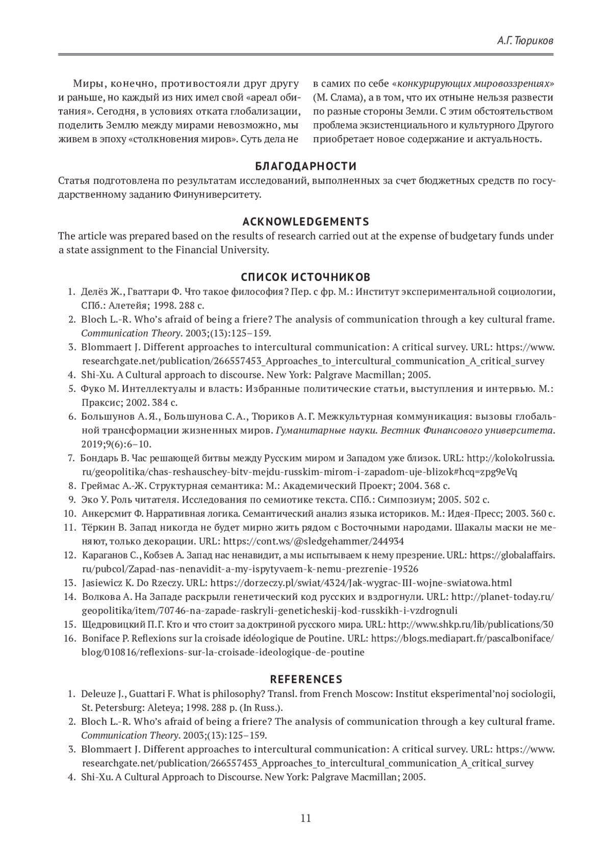 6. Большунов А. Я., Большунова С. А., Тюриков А. Г. Межкультурная коммуникация: вызовы глобальной трансформации жизненных миров. Гуманитарные науки. Вестник Финансового университета. 2019;9(6):6-10.