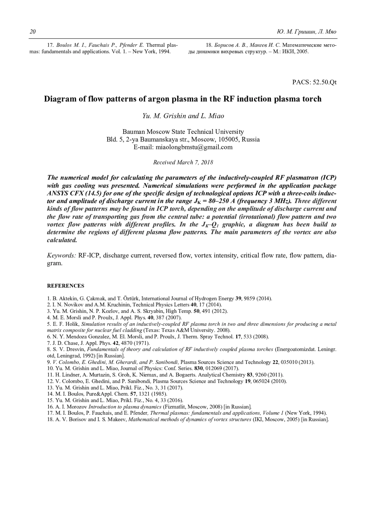 Статья: Диаграмма режимов течения плазмы аргона в канале ВЧИ-плазмотрона (2018)