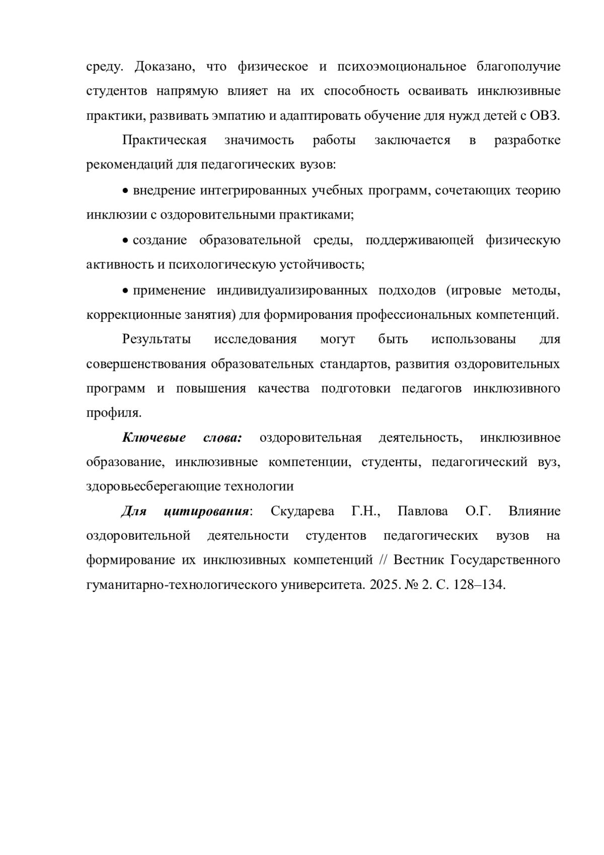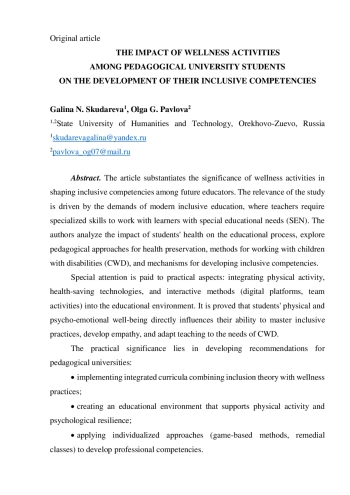 Авторы проводят анализ влияния здоровья студентов на образовательный процесс, рассматривают системы педагогических средств для сохранения здоровья, методы работы с детьми с ОВЗ и механизмы развития инклюзивных компетенций.