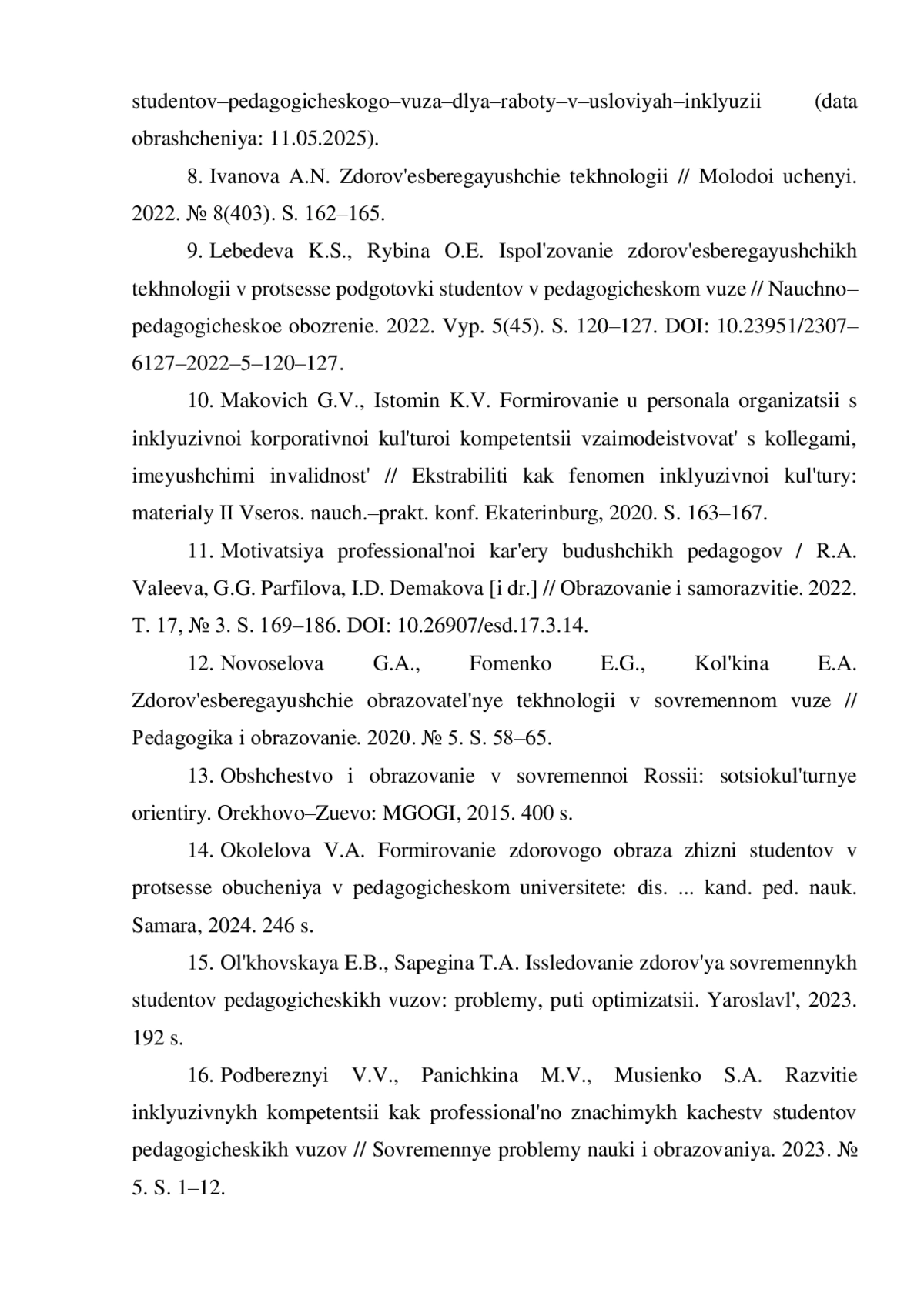 14. Околелова В.А. Формирование здорового образа жизни студентов в процессе обучения в педагогическом университете: дис.. канд. пед. наук. Самара, 2024. 246 с.
