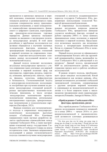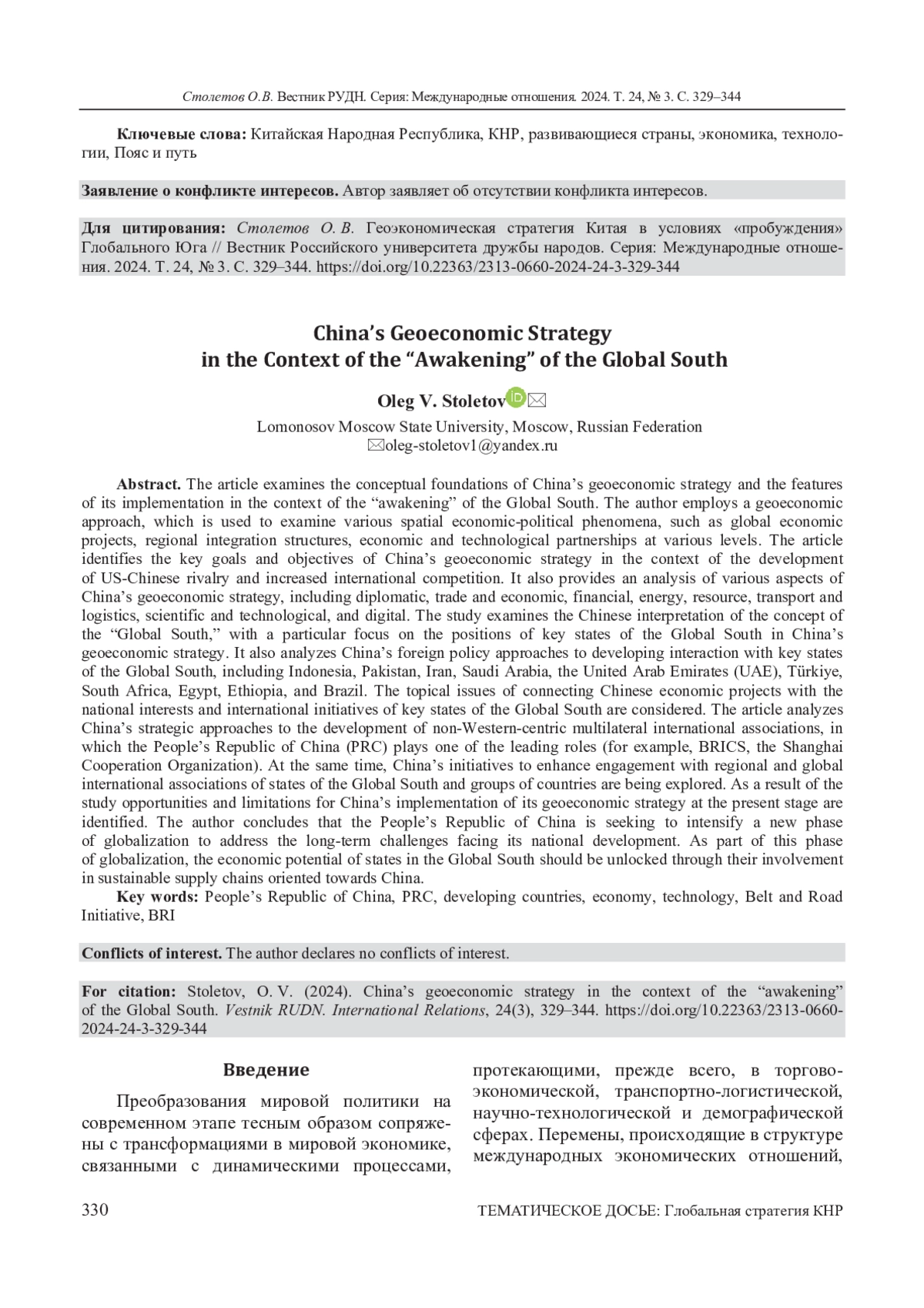 Исследуются концептуальные основания геоэкономической стратегии Китая и особенности реализации этой стратегии в условиях «пробуждения» Глобального Юга. Автор придерживается геоэкономического подхода, который используется для рассмотрения различных пространственных экономико-политических феноменов, таких, как глобальные экономические проекты, региональные интеграционные структуры, экономические и технологические партнерства различного уровня. Выявлены ключевые цели и задачи геоэкономической стратегии Китая в контексте развития американо-китайского соперничества и усиления международной конкуренции. Внимание уделено анализу таких аспектов геоэкономической стратегии Китая, как дипломатический, торгово-экономический, финансовый, энергетический, ресурсный, транспортно-логистический, научно-технологический и цифровой. Рассматривается китайская интерпретация понятия «Глобальный Юг», изучаются позиции ключевых государств Глобального Юга в геоэкономической стратегии Китая, проанализированы внешнеполитические подходы Китая к развитию взаимодействия с ключевыми государствами Глобального Юга, в числе которых Индонезия, Пакистан, Иран, Саудовская Аравия, Объединенные Арабские Эмираты (ОАЭ), Турция, Южно-Африканская Республика (ЮАР), Египет, Эфиопия и Бразилия. Изучены актуальные вопросы сопряжения китайских экономических проектов с национальными интересами и международными инициативами ключевых государств Глобального Юга, а также стратегические подходы Китая к развитию незападноцентричных многосторонних международных объединений, в которых Китайская Народная Республика (КНР) играет одну из ведущих ролей (например, БРИКС, Шанхайская организация сотрудничества). Также описаны инициативы Китая по интенсификации взаимодействия с региональными и глобальными международными объединениями государств Глобального Юга и группами стран. Охарактеризованы возможности и ограничения для реализации Китаем своей геоэкономической стратегии на современном этапе. Автор приходит к выводу, что Китайская Народная Республика, решая долгосрочные задачи своего национального развития, стремится активизировать новую фазу глобализации, в рамках которой должно произойти раскрытие экономического потенциала государств Глобального Юга посредством их вовлечения в устойчивые цепочки поставок, ориентированные на Китай.