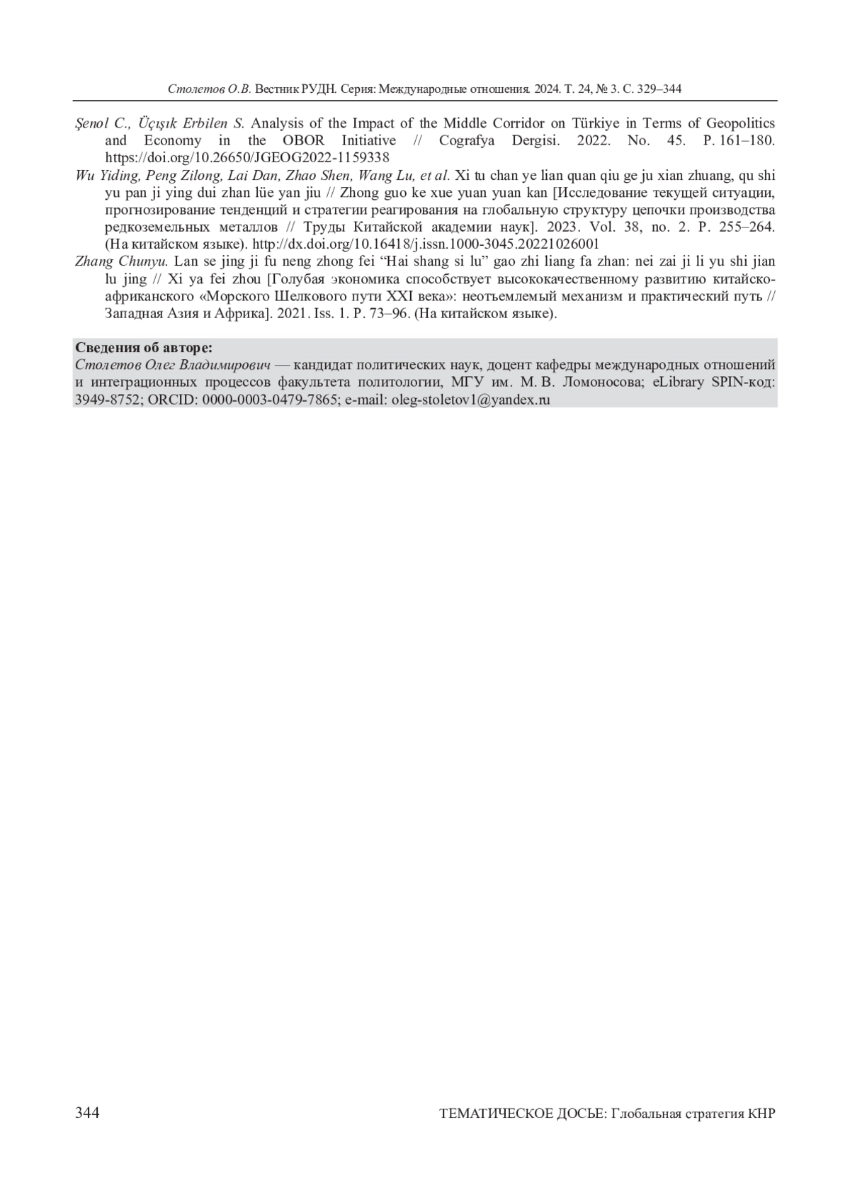 19. Şenol C., Üçışık Erbilen S. Analysis of the Impact of the Middle Corridor on Türkiye in Terms of Geopolitics and Economy in the OBOR Initiative // Cografya Dergisi. 2022. No. 45. P. 161-180. DOI: 10.26650/JGEOG2022-1159338 EDN: WRJTBS
