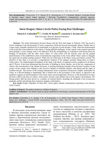 1. Акимов Р. Х. Арктика с китайской спецификой // Арктика и Север. 2023. № 50. С. 89-108. ;. DOI: 10.37482/issn2221-2698.2023.50.89 EDN: YASXGE