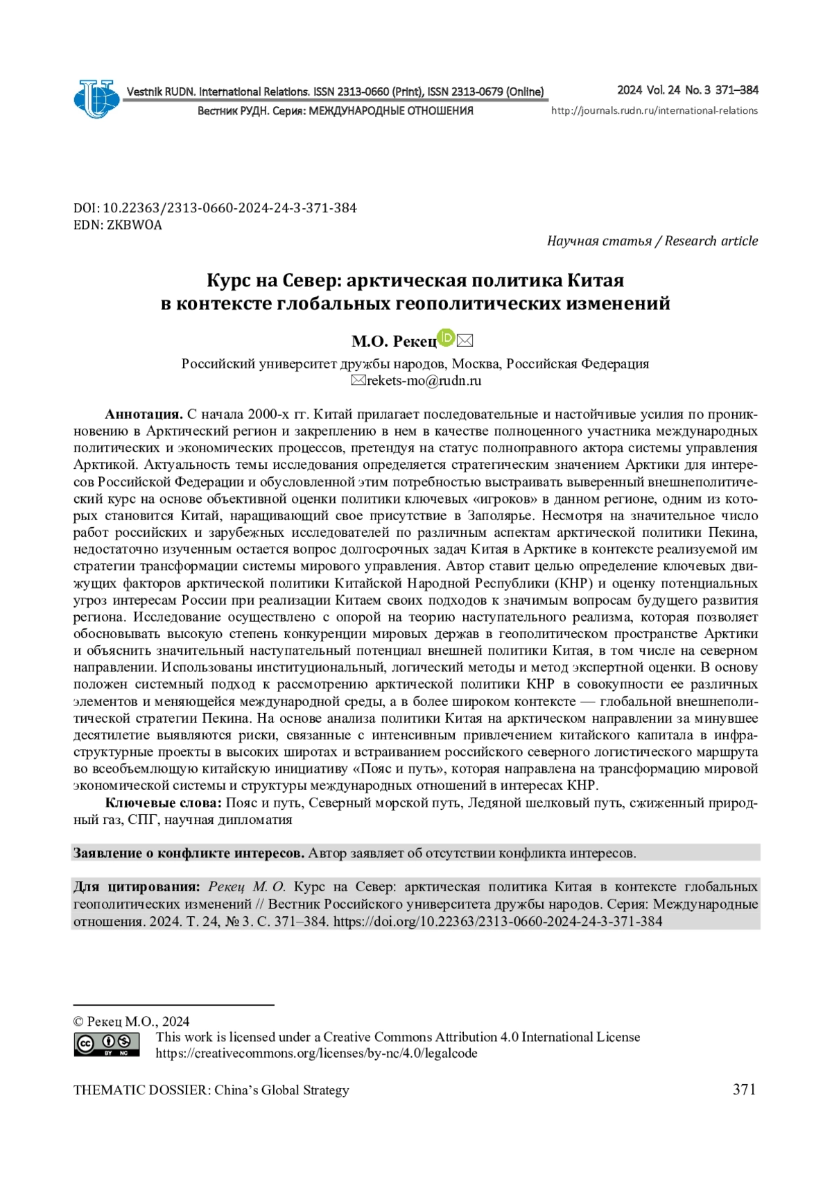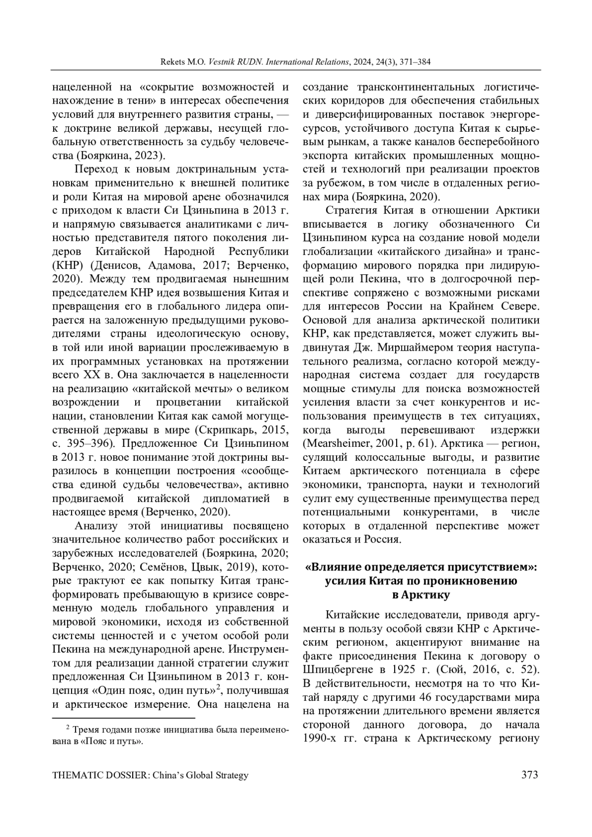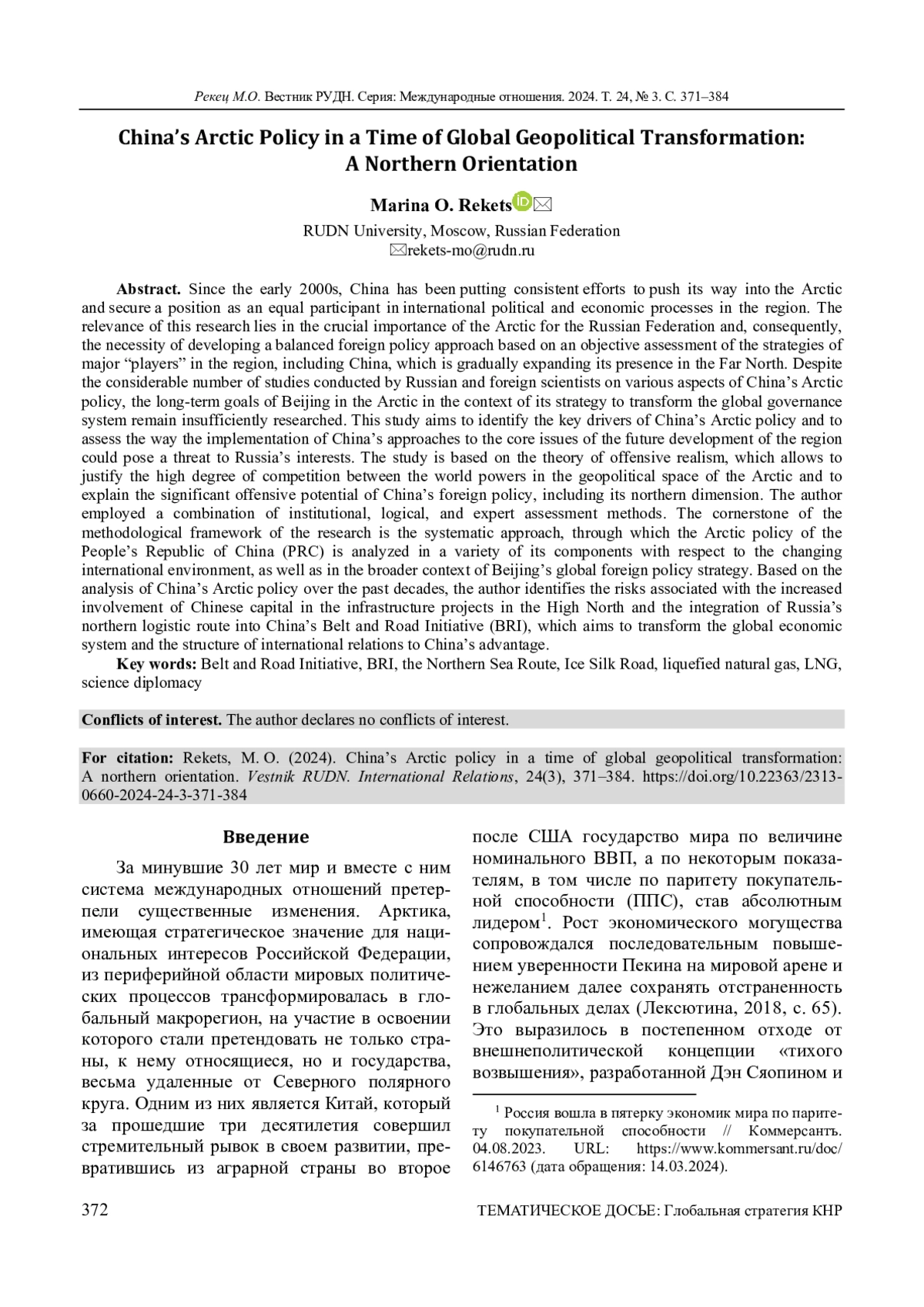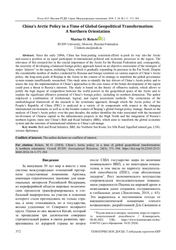 С начала 2000-х гг. Китай прилагает последовательные и настойчивые усилия по проникновению в Арктический регион и закреплению в нем в качестве полноценного участника международных политических и экономических процессов, претендуя на статус полноправного актора системы управления Арктикой. Актуальность темы исследования определяется стратегическим значением Арктики для интересов Российской Федерации и обусловленной этим потребностью выстраивать выверенный внешнеполитический курс на основе объективной оценки политики ключевых «игроков» в данном регионе, одним из которых становится Китай, наращивающий свое присутствие в Заполярье. Несмотря на значительное число работ российских и зарубежных исследователей по различным аспектам арктической политики Пекина, недостаточно изученным остается вопрос долгосрочных задач Китая в Арктике в контексте реализуемой им стратегии трансформации системы мирового управления. Автор ставит целью определение ключевых движущих факторов арктической политики Китайской Народной Республики (КНР) и оценку потенциальных угроз интересам России при реализации Китаем своих подходов к значимым вопросам будущего развития региона. Исследование осуществлено с опорой на теорию наступательного реализма, которая позволяет обосновывать высокую степень конкуренции мировых держав в геополитическом пространстве Арктики и объяснить значительный наступательный потенциал внешней политики Китая, в том числе на северном направлении. Использованы институциональный, логический методы и метод экспертной оценки. В основу положен системный подход к рассмотрению арктической политики КНР в совокупности ее различных элементов и меняющейся международной среды, а в более широком контексте - глобальной внешнеполитической стратегии Пекина. На основе анализа политики Китая на арктическом направлении за минувшее десятилетие выявляются риски, связанные с интенсивным привлечением китайского капитала в инфраструктурные проекты в высоких широтах и встраиванием российского северного логистического маршрута во всеобъемлющую китайскую инициативу «Пояс и путь», которая направлена на трансформацию мировой экономической системы и структуры международных отношений в интересах КНР.