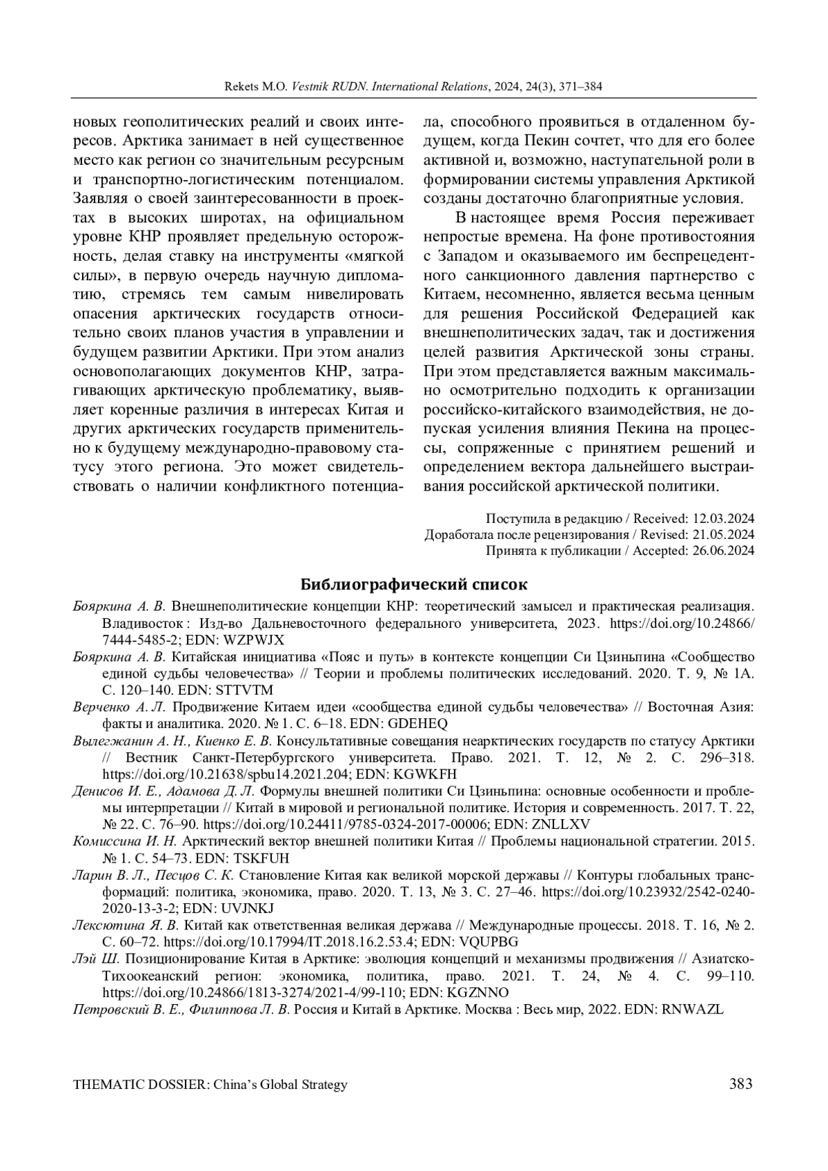 11. Петровский В. Е., Филиппова Л. В. Стратегия Китая по освоению Арктики и перспективы российско-китайского сотрудничества в регионе // Китай в мировой и региональной политике. История и современность. 2018. Т. 23, № 23. С. 171-182. ;. DOI: 10.24411/2618-6888-2018-10013 EDN: PLLETU