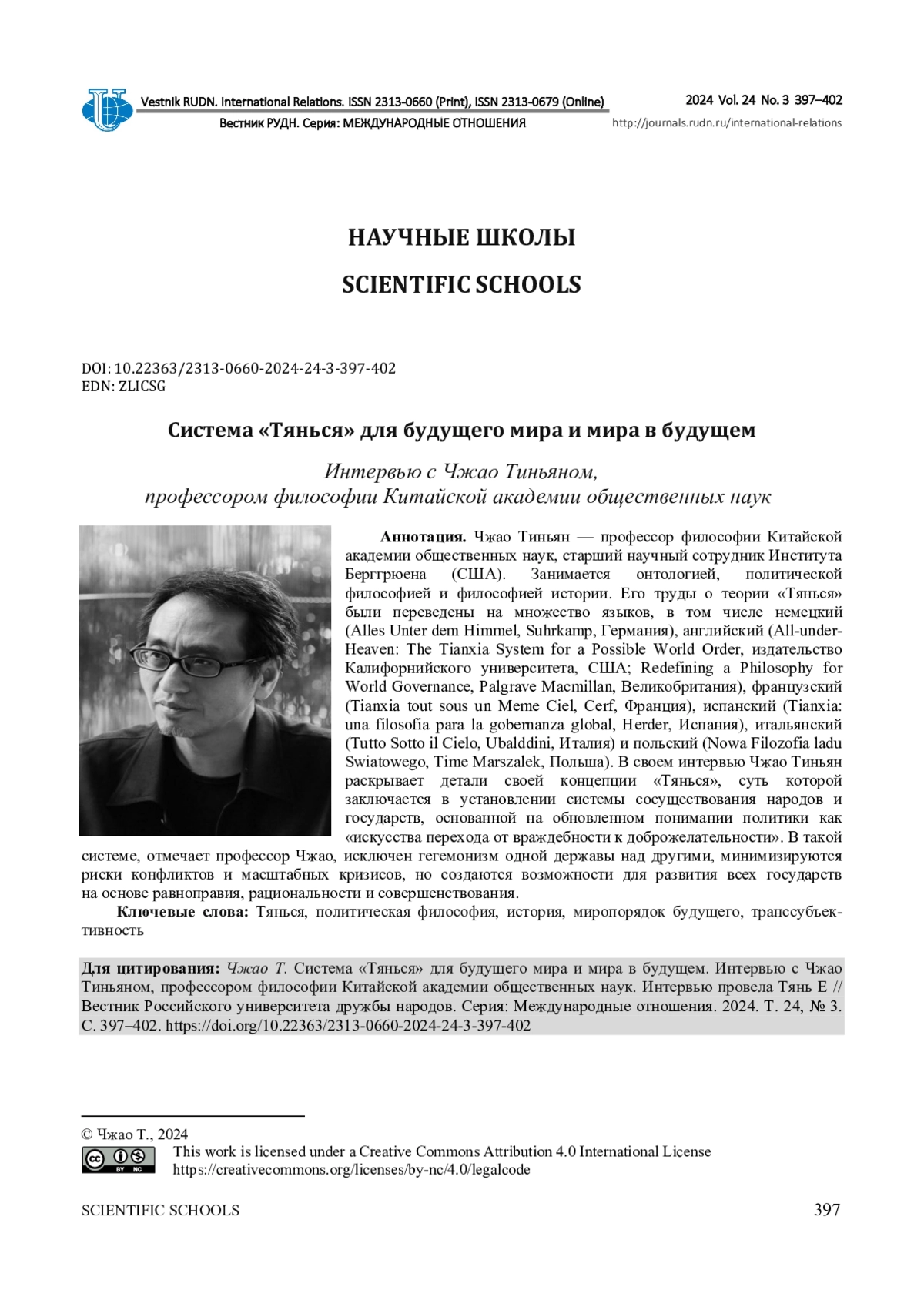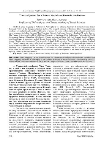 Чжао Тиньян - профессор философии Китайской академии общественных наук, старший научный сотрудник Института Берггрюена (США). Занимается онтологией, политической философией и философией истории. Его труды о теории «Тянься» были переведены на множество языков, в том числе немецкий (Alles Unter dem Himmel, Suhrkamp, Германия), английский (All-under-heaven: The Tianxia System for a Possible World Order, издательство Калифорнийского университета, США; Redefining a Philosophy for World Governance, Palgrave Macmillan, Великобритания), французский (Tianxia tout sous un Meme Ciel, Cerf, Франция), испанский (Tianxia: una filosofia para la gobernanza global, Herder, Испания), итальянский (Tutto Sotto il Cielo, Ubalddini, Италия) и польский (Nowa Filozofia ladu Swiatowego, Time Marszalek, Польша). В своем интервью Чжао Тиньян раскрывает детали своей концепции «Тянься», суть которой заключается в установлении системы сосуществования народов и государств, основанной на обновленном понимании политики как «искусства перехода от враждебности к доброжелательности». В такой системе, отмечает профессор Чжао, исключен гегемонизм одной державы над другими, минимизируются риски конфликтов и масштабных кризисов, но создаются возможности для развития всех государств на основе равноправия, рациональности и совершенствования.