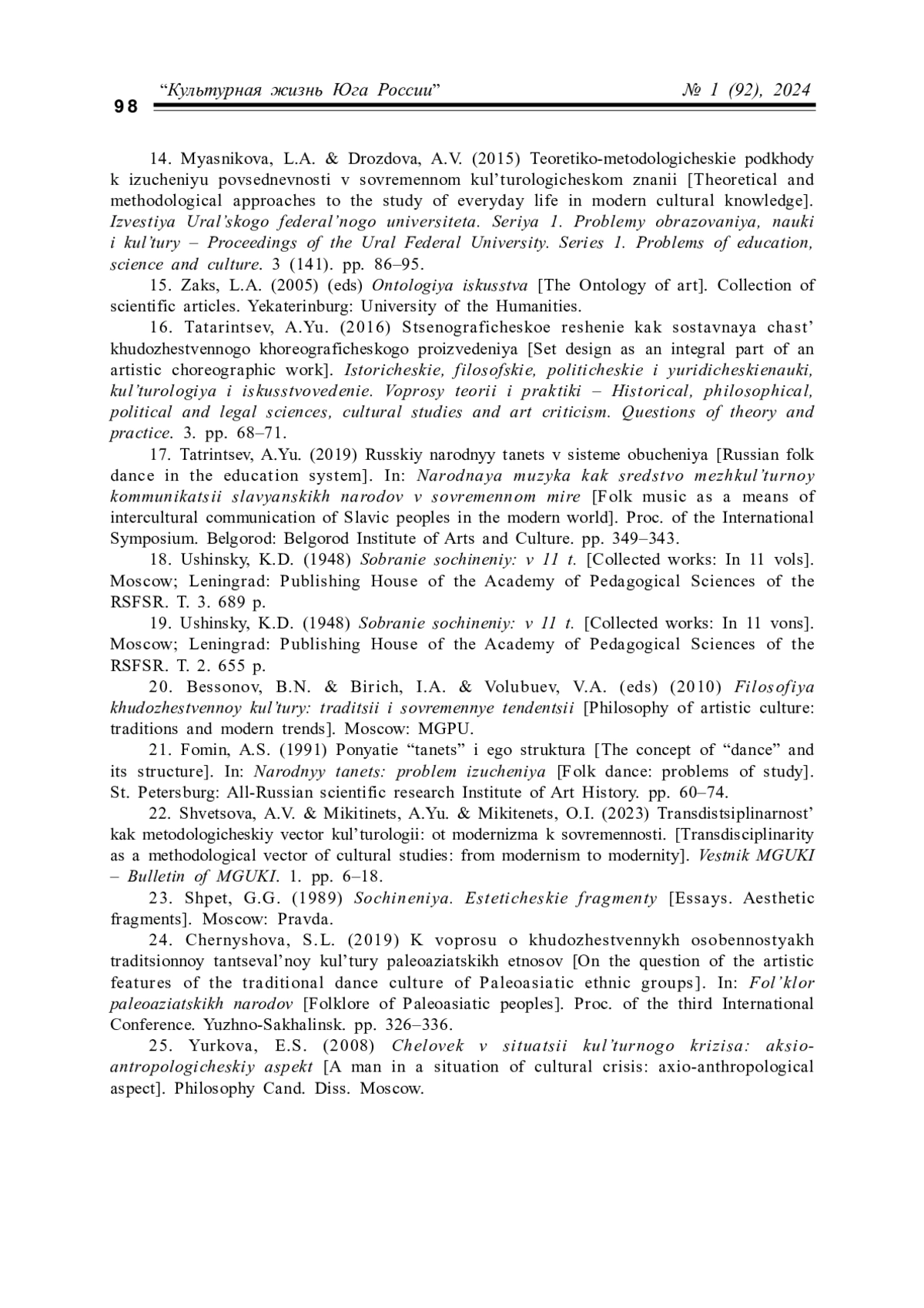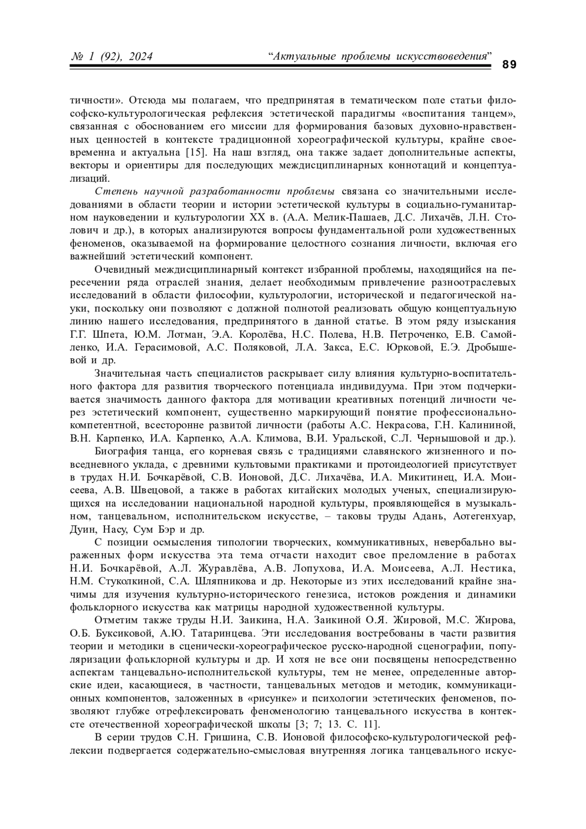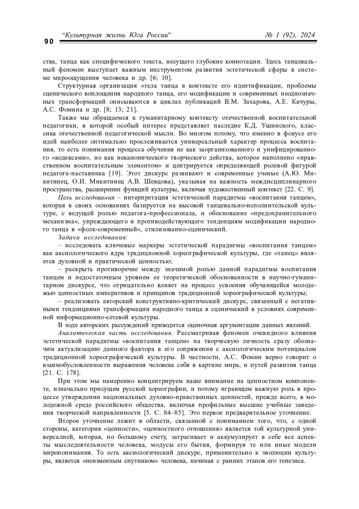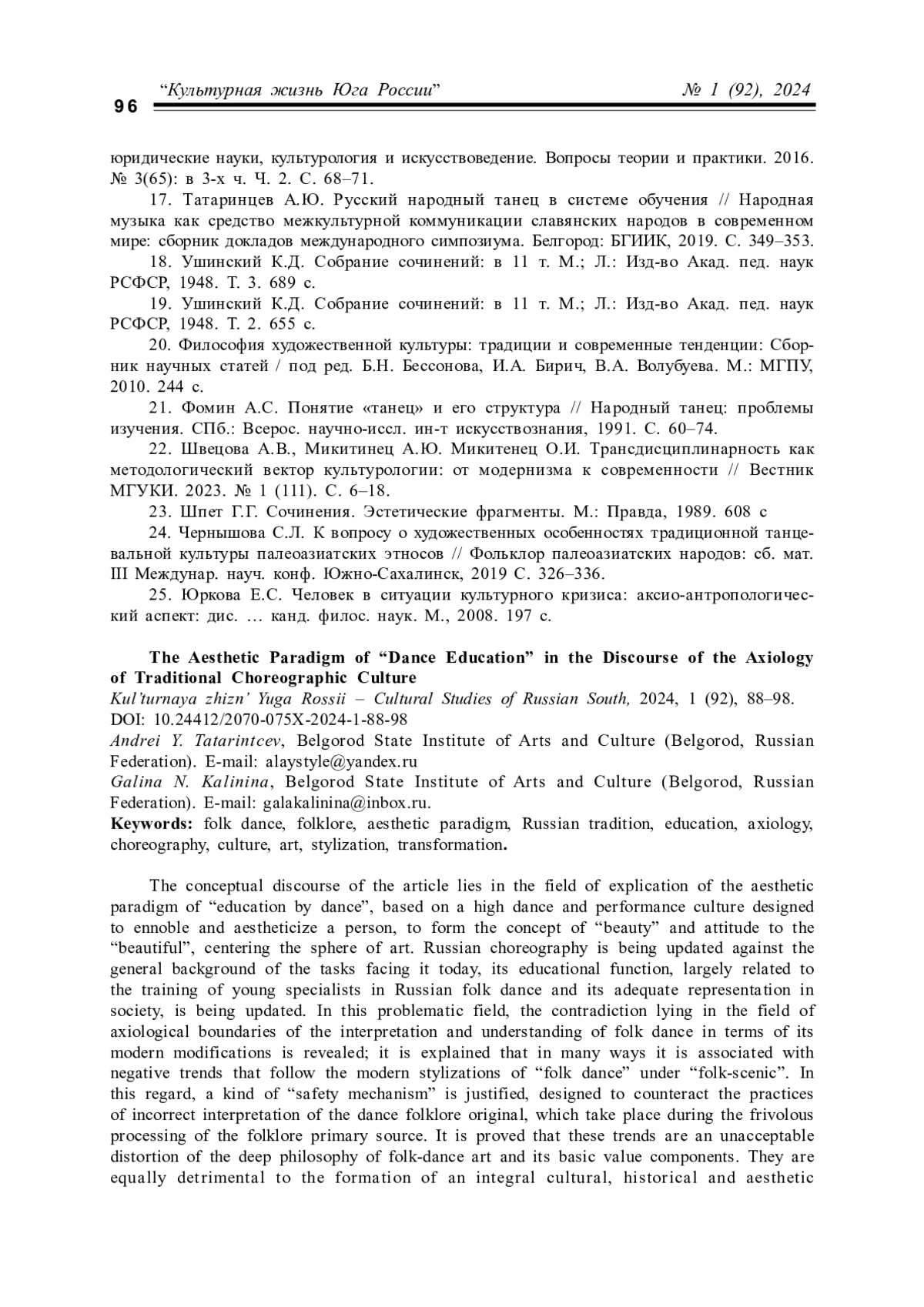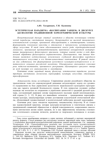 ТАТАРИНЦЕВ А. Ю., КАЛИНИНА Г. Н. ЭСТЕТИЧЕСКАЯ ПАРАДИГМА "ВОСПИТАНИЯ ТАНЦЕМ" В ДИСКУРСЕ АКСИОЛОГИИ ТРАДИЦИОННОЙ ХОРЕОГРАФИЧЕСКОЙ КУЛЬТУРЫ // КУЛЬТУРНАЯ ЖИЗНЬ ЮГА РОССИИ. 2024. № 1 (92)